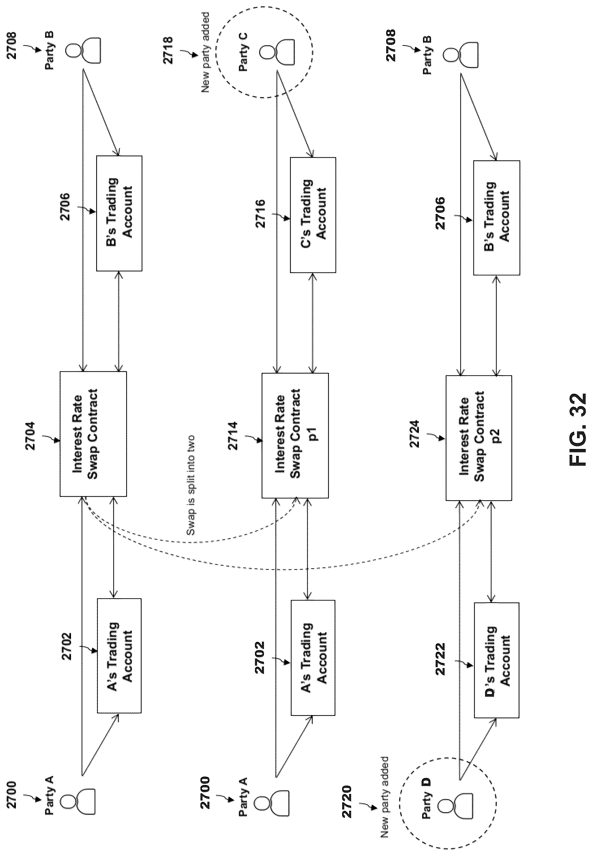 [0165]Referring now to FIG. 32 an illustration of a scenario where a single IRS contract is split into two IRS contracts and a new party is added, is described in detail. Part A 2700 has a trading account 2702 and Party B 2708 has a trading account 2706. The trading accounts interact with the IRS contract 2704. The IRS contract 2704 can be split into two contracts 2714 and 2724. In the updated IRS contract 2714 a new Party C 2714 with trading account 2716 is added replacing Part B 2708 and in the updated IRS contract 2724 a new Party DC 2720 with trading account 2022 is added replacing Party A 2710. In some embodiments, Parties C and D 2718, 2720 may be the same party.