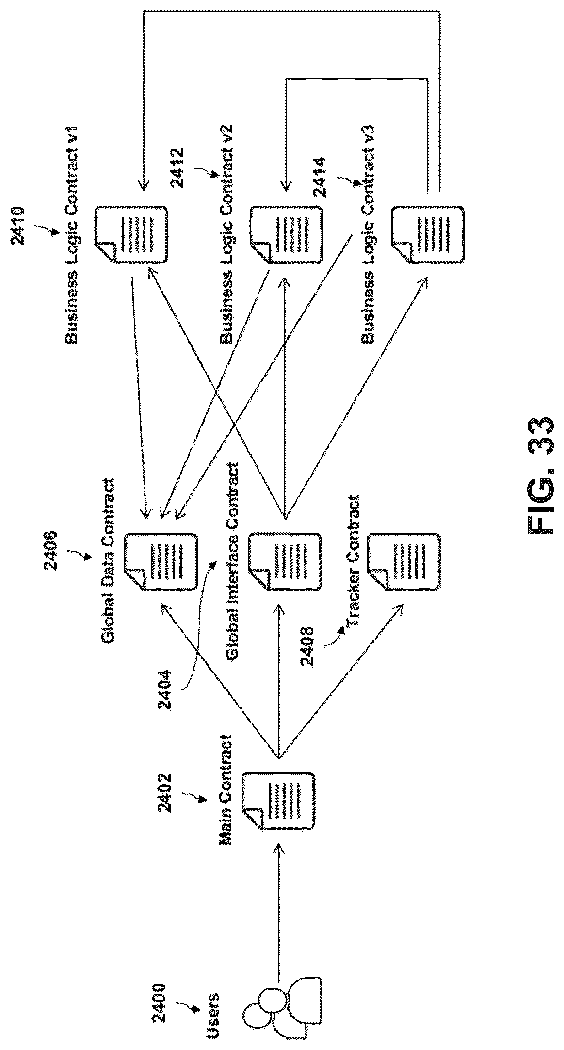 [0167]Referring now to FIG. 33 an illustration of an approach for tracking updates in multi-party linked smart contracts, is described in more detail. In this approach the contract Data, Interface and Logic is separated into different contracts which are tracked through a Tracker contract and glued together by a main contract 2402. The main contract 2402 may serve as a central point of data, interface, logic, and tracker contracts for the multi-party linked smart contracts, as will be discussed below. The main contract 2402 may comprise addresses on blockchain networks upon which the multi-party linked smart contracts are deployed. Furthermore, the main contract 2402 may be the smart contract that interfaces with users 2400. The multi-party linked smart contracts may further comprise a global data contract 2406. All data is stored in the global data contract 2406. The multi-party linked smart contracts may further comprise a global interface contract 2404. The global interface contract 2404 may provide an interface to the business logic which is implemented by one or more business logic contracts. The multi-party linked smart contracts may further comprise a tracker contract 2408. The tracker contract 2408 tracks updates to contracts of the multi-party linked smart contracts. The multi-party linked smart contracts may further comprise one or more business logic contracts 2410, 2412, 2414, which may implement the business logic. There can be one or more such contracts which can reference each other. The business logic may be understood as the transactional requirements and obligations agreed upon by the multiple parties and the underlying functions to enforce and perform such agreed-upon requirements and obligations.