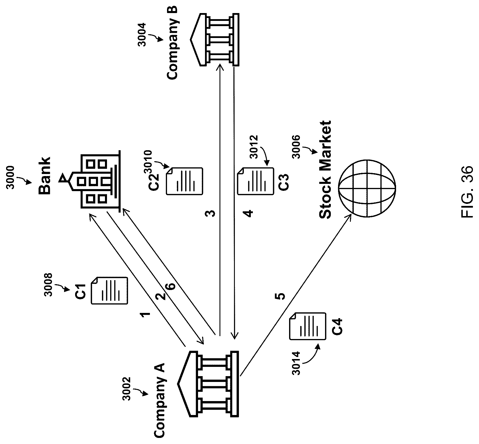 [0173]Referring now to FIG. 36, an illustration of how a fraud can be orchestrated through a network of smart contracts is presented. Companies A and B 3002, 3004 are owned by the same entity but registered separately. Their goal is to artificially inflate the stock price of Company A by “circular trading” or “round-tripping,” when identical buy and sell orders are entered at the same time with the same number of shares and the same price. As a result, there is no change in ownership of shares, but there is the appearance of an increased trade volume. At step 1 Company A 3002 creates a smart contract (C1) 3008 to receive a large loan from Bank 3000, using its assets as collateral. At step 2, Company A creates a smart contract (C2) 3010 to provide a line of credit to Company B 3004, which appears unrelated. At step 3, Company B uses the line of credit to purchase Company A's stock as allowed in C2. At step 4, Company B creates a contract (C3) 3012 to purchase a large amount of Company A stock using the line of credit. At step 5, the stock purchase drives up the share price of Company A. At step 6, Company A creates a contract (C4) 3014 to sell its shares, now at an inflated price, to pay back the original loan from the Bank.