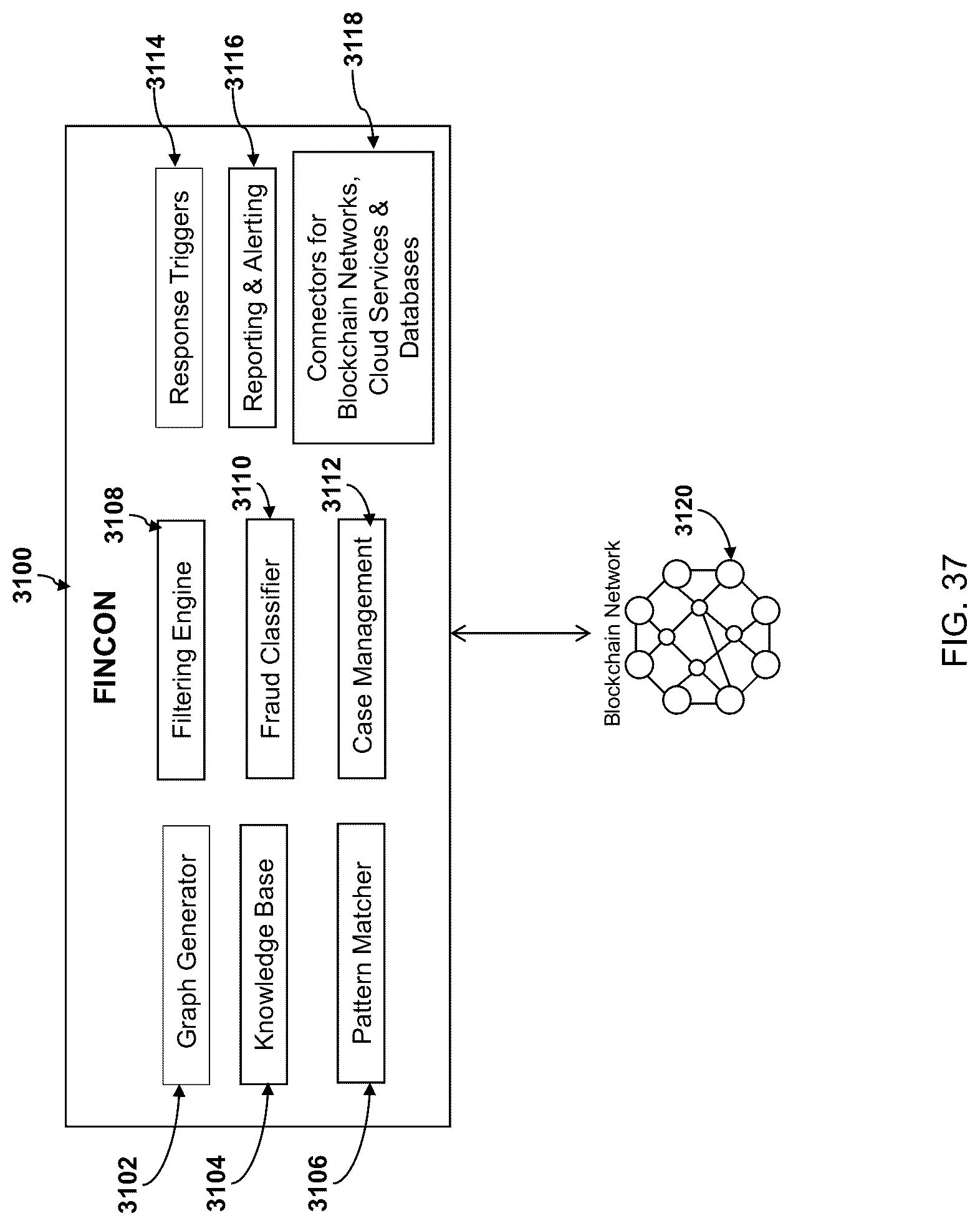 [0174]Referring now to FIG. 37, an illustration of the architecture of a system for forensic investigations in contract networks according to an embodiment of the invention is presented. The figure shows the components of FINCON (Forensic Investigation in Contract Networks), a system 3100 for fraud detection, auditing, and pattern recognition across networks of blockchain smart contracts. The system 3100 comprises the following components:
