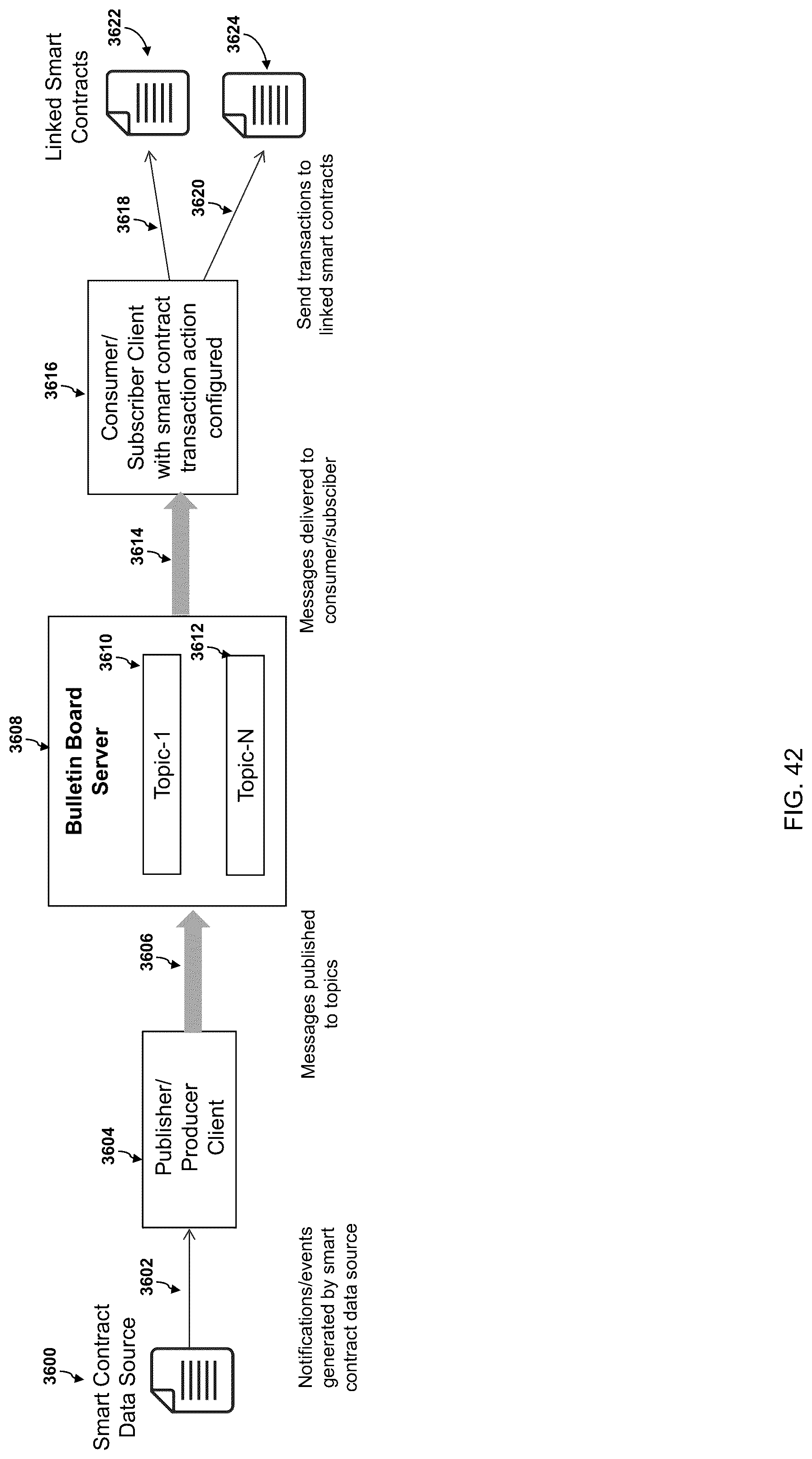 [0210]Referring now to FIG. 42 an illustration of a smart contract data source that uses an external publisher client to publish messages to the publish-subscribe messaging framework is described in more detail. A smart contract data source 3600 such as a Solidity smart contract generates notifications or events 3602. A publisher/producer client 3604 watches for the notifications or events generated by the smart contract 3600. When a notification or event is generated, the messages are published 3606 to the topics 3610, 3612 managed by the Bulletin Board 3608. These messages are delivered 3614 to the consumer/subscriber client 3616 which has subscribed to the topics 3610, 3612. The consumer/subscriber client 3616 has a smart contract transaction action configured which sends transactions 3618, 3620 to the linked smart contracts 3622, 3624 on receiving the messages.