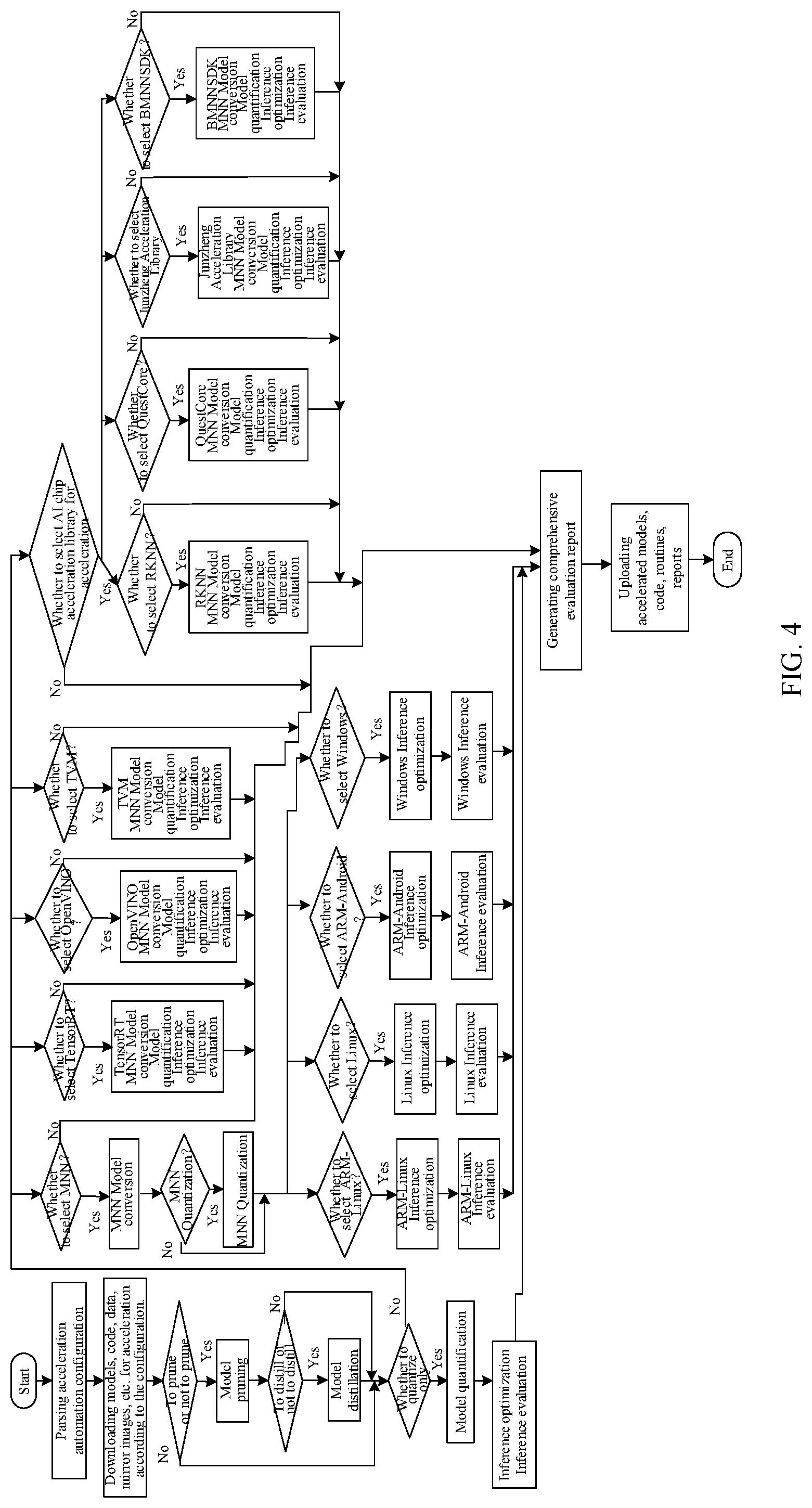 Among them, the categories of accelerating process can include model compression, graph optimization and deployment optimization. When the category of accelerating process is model compression, the sub-categories of accelerating process can include model quantification, model pruning and model distillation. When the category of accelerating process is graph optimization, the sub-category of accelerating process can include eliminating unnecessary nodes, replacing a more costly operator with a less costly operator, fusing successive operators into one operator, eliminating the a calculated expression and using the a calculated value as a replacement; and, eliminating dead code, etc.. When the category of accelerating process is deployment optimization, the sub-categories of accelerating process can include: selecting corresponding model acceleration tools to accelerate the model according to the category of deployment platform; according to the software and hardware resources of the current deployment platform, selecting the corresponding software and hardware optimization strategy. When the sub-category of accelerating process is to select a corresponding model acceleration tool for model acceleration according to the category of the deployment platform, the sub-category may include a first sub-category, which may include: the deployment platform is an ARM mobile terminal or a terminal, and MNN and/or TVM are selected for acceleration; the deployment platform is Intel CPU, and OpenVINO and/or TVM are selected for acceleration; the deployment platform is NVIDIA GPU, and TensorRT/or TVM is selected for acceleration; the deployment platform uses the AI chip of a specific AI chip manufacturer, and selects the acceleration library of the specific AI chip manufacturer for acceleration. When the accelerating process sub-category is to select a corresponding software and hardware optimization strategy according to the software and hardware resources of the current deployment platform, the sub-category may include a second sub-category, which may include parallel thread optimization, hardware built-in mapping optimization, loop optimization, memory allocation reading optimization and memory latency hiding optimization. In some exemplary embodiments, the method further includes: