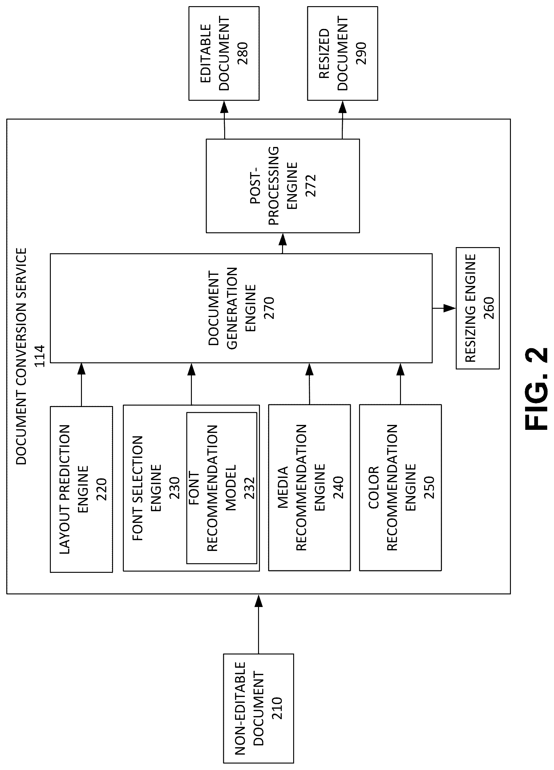 FIG. 2 depicts an example of some elements involved in converting a non-editable document to an editable document.