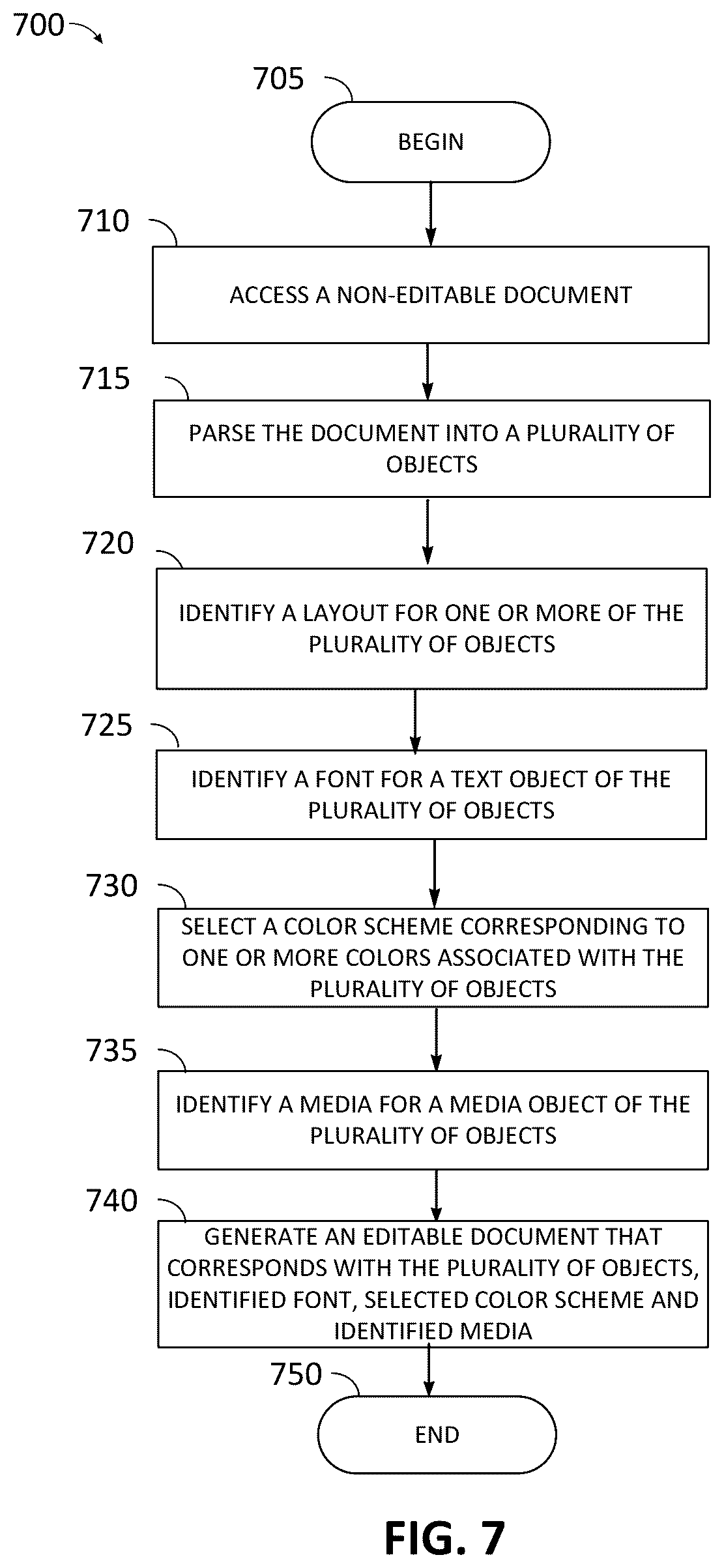 • automatically generating an editable document in accordance with at least one of the identified layout, identified font and selected color scheme.