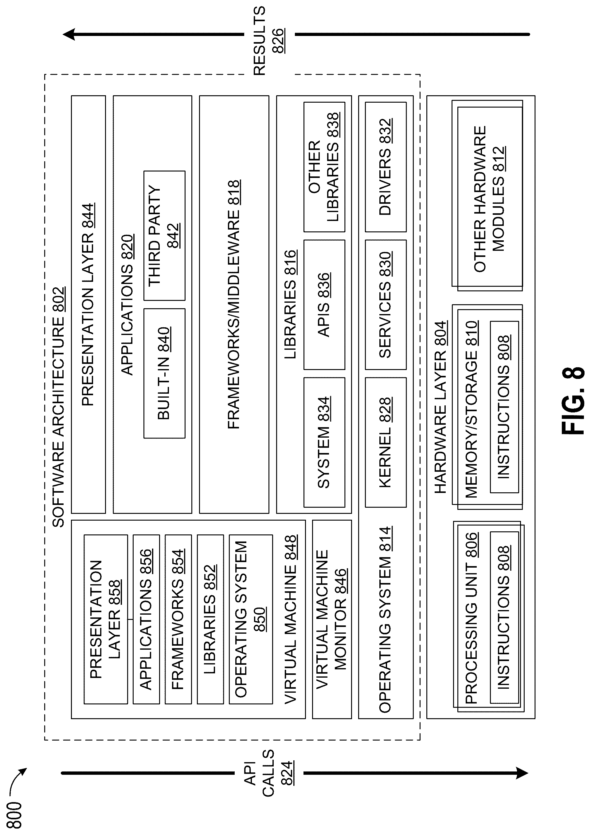 In some examples, the communication components 964 may detect identifiers or include components adapted to detect identifiers. For example, the communication components 964 may include Radio Frequency Identification (RFID) tag readers, NFC detectors, optical sensors (for example, one- or multi-dimensional bar codes, or other optical codes), and/or acoustic detectors (for example, microphones to identify tagged audio signals). In some examples, location information may be determined based on information from the communication components 962, such as, but not limited to, geo-location via Internet Protocol (IP) address, location via Wi-Fi, cellular, NFC, Bluetooth, or other wireless station identification and/or signal triangulation.