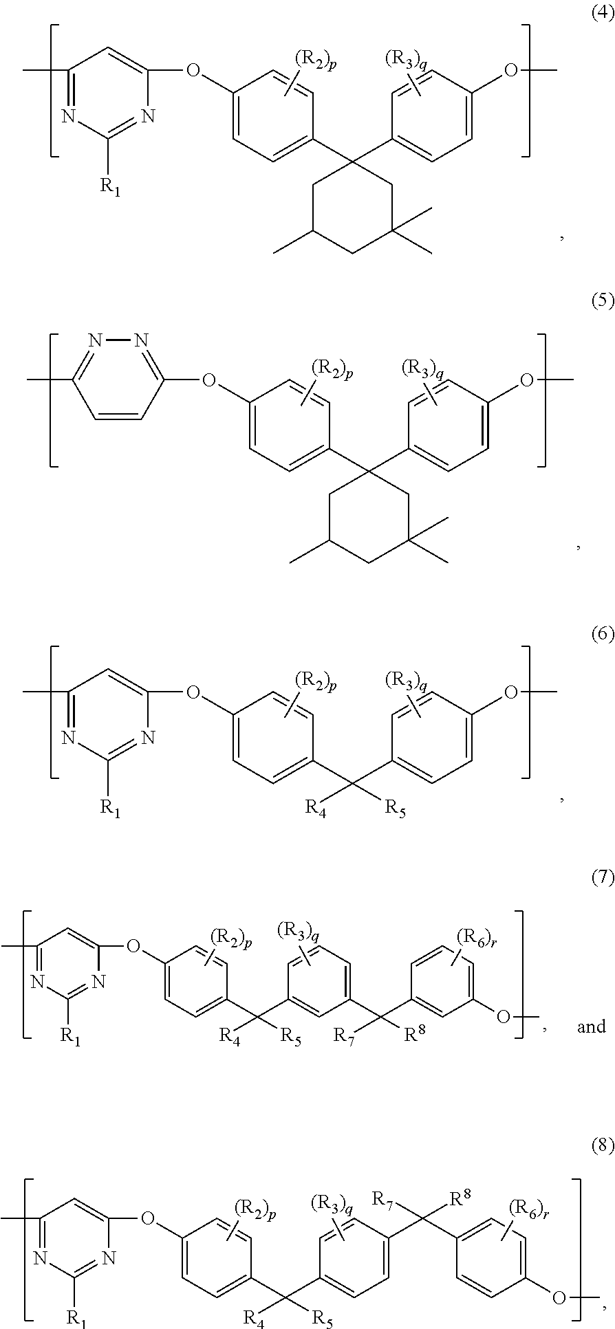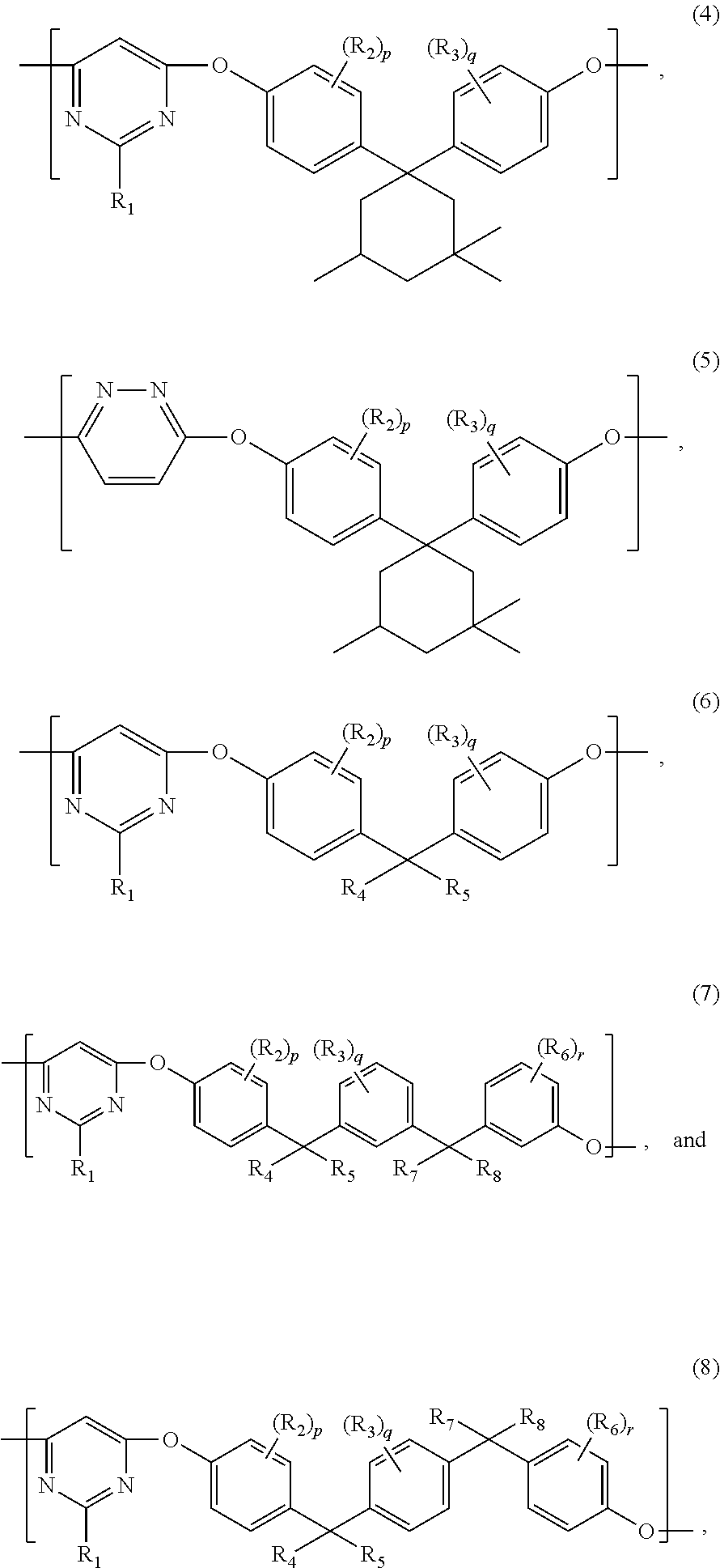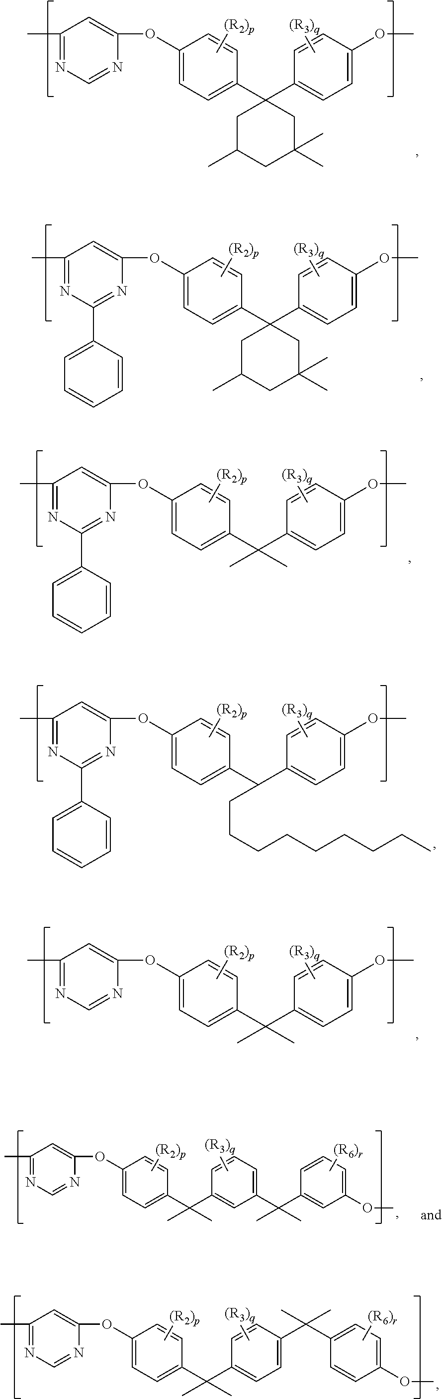 13. The composition of claim 1, wherein the at least one low dielectric loss polymer comprises a poly(arylene ether) polymer comprising a monomer unit containing a pyrimidine, pyrazine, or pyridazine group.