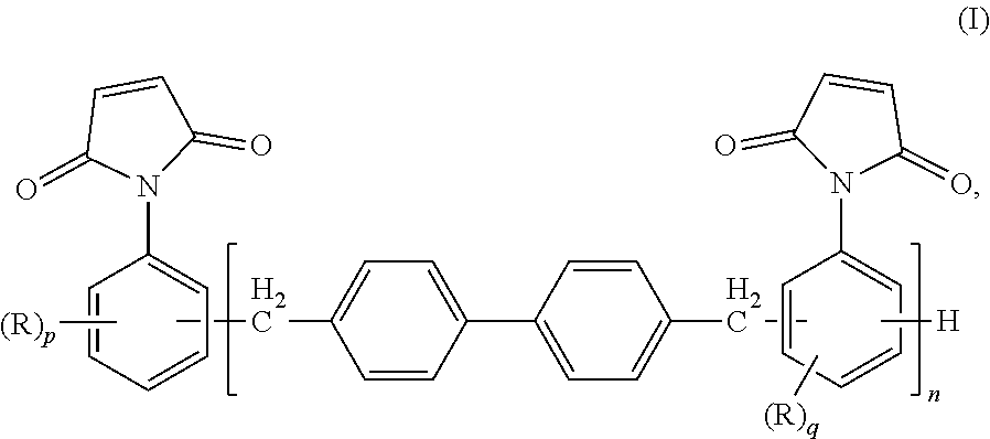 at least one maleimide-containing compound comprising a bismaleimide compound or a polymaleimide; at least one low dielectric loss polymer or a hydrogenated derivative thereof, the at least one low dielectric loss polymer comprising a poly(phenylene ether), or a copolymer comprising a styrene monomer unit, an ethylene monomer unit, a propylene monomer unit, a butylene monomer unit, a butadiene monomer unit, an isoprene monomer unit, a divinylbenzene monomer unit, a pyrimidine monomer unit, or a pyridazine monomer unit; at least one filler; and at least one radical initiator. 56. The composition of 57. The composition of 58. The composition of in which n is an integer from 1 to 10, or n is an integer with an average value of about 1.3, or n is an integer with an average value of about 3.1. 59. The composition of 60. The composition of 61. The composition of in which R1is H, C1-C10alkyl, or aryl; each of R2, R3, and R6, independently, is C1-C10alkyl; each of R4, R5, R7, and R8is H or C1-C10alkyl; p is an integer from 0 to 4; q is an integer from 0 to 4; and r is an integer from 0 to 4. 62. The composition of in which