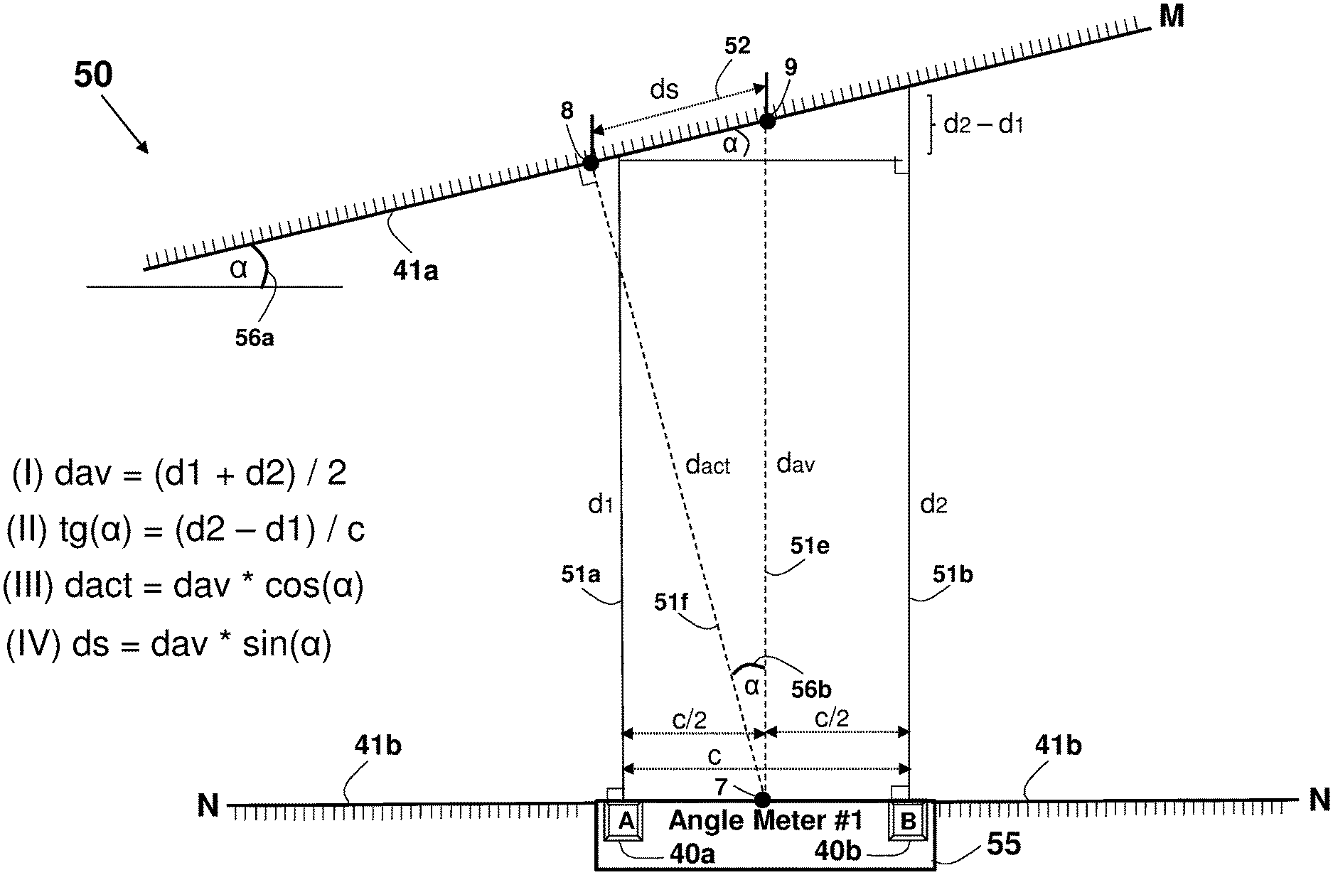 A method and apparatus for an angle meter cooperatively using two or more non-contact distance meters for measuring distances to a surface along substantially parallel lines. The measured distances are used for estimating or calculating the angle to the surface and the distance to the surface. The distance meters may use optical means, where a visible or non-visible light or laser beam is emitted and received, acoustical means, where an audible or ultrasound sound is emitted and received, or an electro-magnetic scheme, where radar beam is transmitted and received. The distances may be estimated using a Time-of-Flight (TOF), homodyne or heterodyne phase detection schemes. The distance meters may share the same correlator, signal conditioning circuits, or the same sensor. Two or more angle meters may be used defining parallel or perpendicular measurement planes, for measuring angles between surfaces, and for estimating physical dimensions such as length, area or volume.