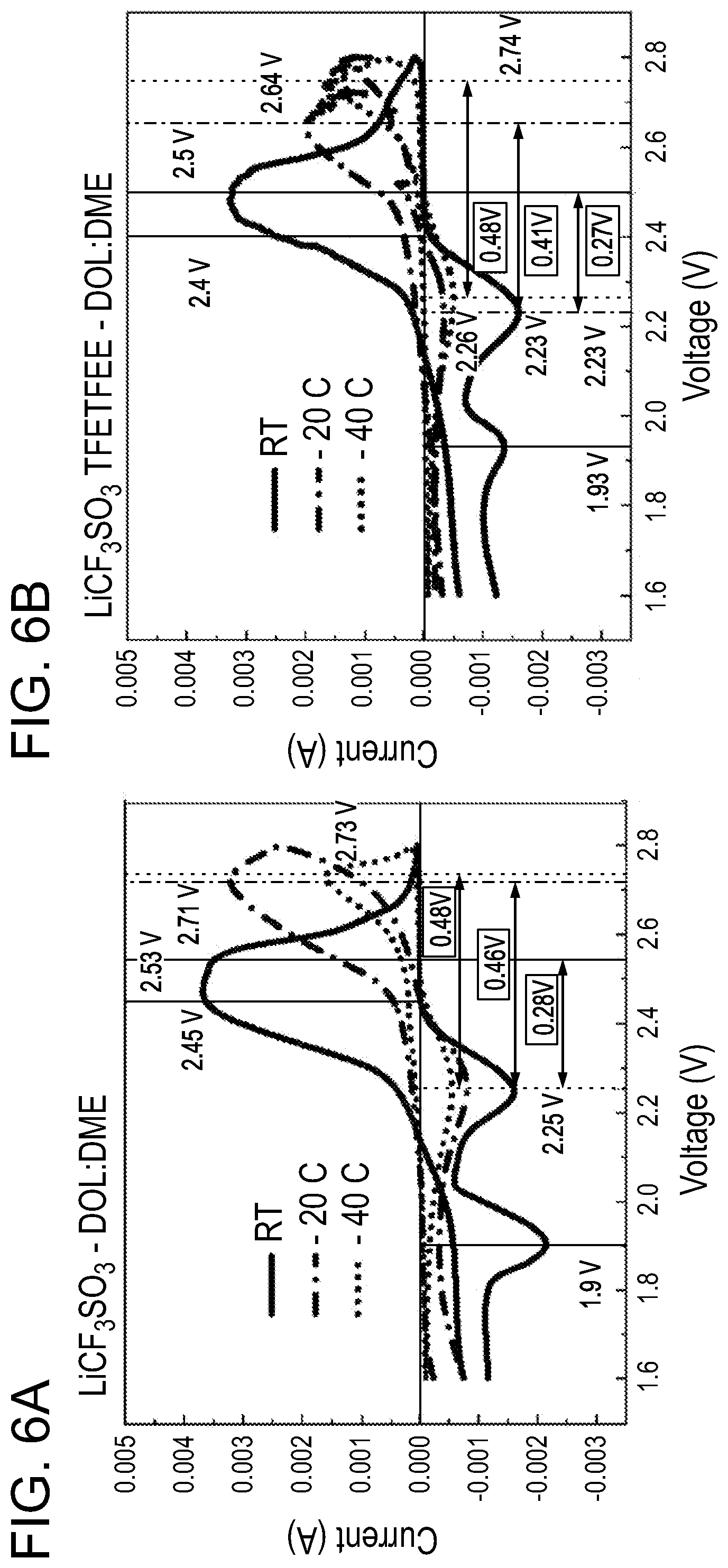 IV. Effect of Fluorinated Cosolvent on Low-Temperature Performance. FIG. 6 represents the CV of 1M LiCF3SO3+0.3M LiNO3in DOL:DME (50:50 vol %) without, as shown in FIG. 6A, and with, as shown in FIG. 6B, 10 vol % TFETFEE cosolvent additive. The addition of 10 vol % fluorinated cosolvent (TFETFEE) lowers the overpotential for sulfur redox reaction at RT (0.27V) and −20° C. (0.41V) compared to the cells without fluorinated cosolvent additive. The cells with fluorinated cosolvent has a significant reduction in peak intensity at 1.9-1.95V (Reaction ii), due to reduced polysulfide reaction. However, the fluorinated cosolvent electrolyte reacts with the Li-metal anode at −20° C. as evident from the noisy anodic peak in the CV between 2.6V and 2.8V, as shown in FIG. 6B. The fluorinated cosolvent electrolyte helps decrease polysulfide dissolution and enable sulfur conversion reaction at −40° C.