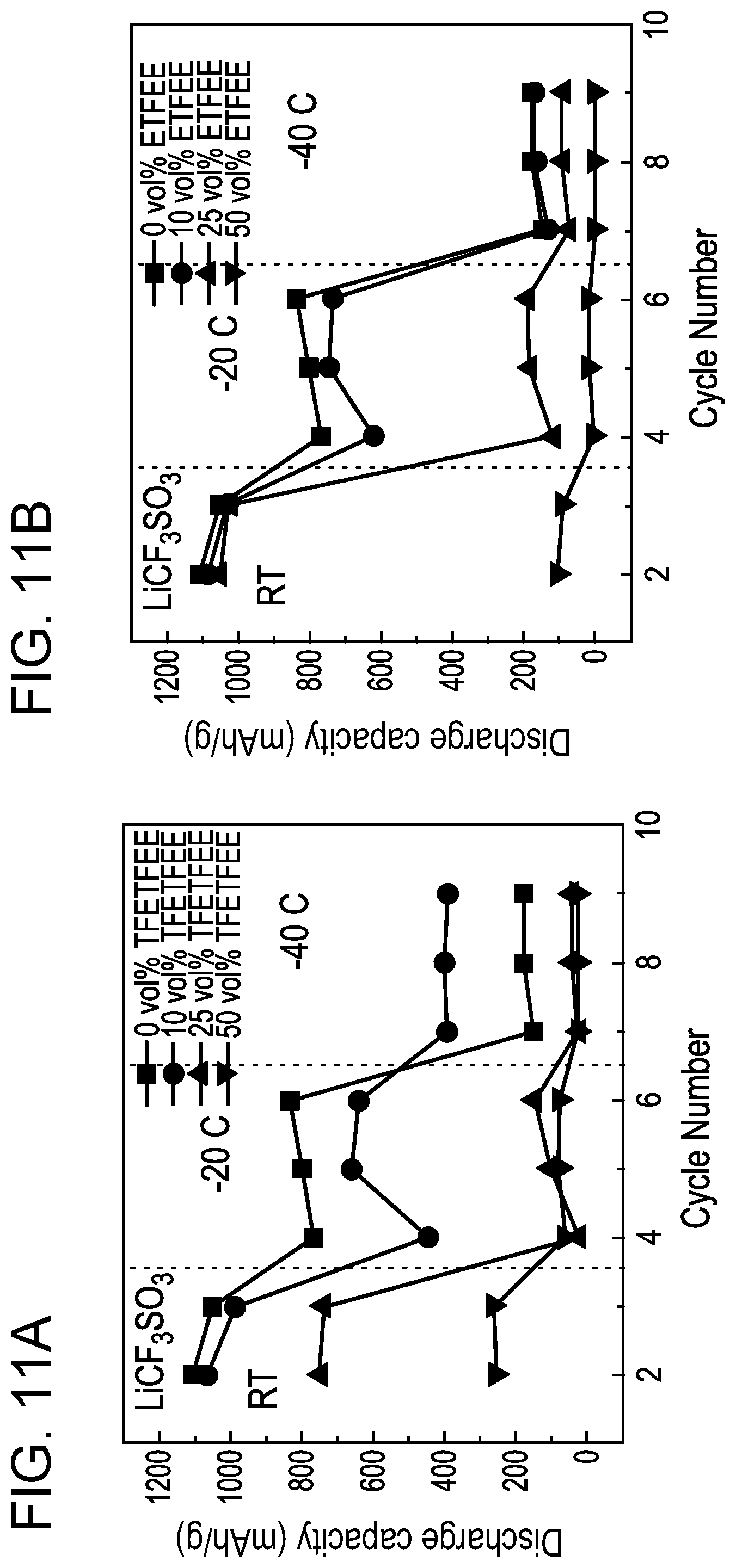 The composition of fluorinated co-solvent in the electrolyte was evaluated at a volume % content of 0%, 10%, 25%, and 50%, as shown in FIGS. 11A and 11B. In the case of TFETFEE and ETFEE, increasing the cosolvents to over 10% of the total solvent volume leads to reduced performance. The likely reason for this is decreased solubility of the salt with decreasing temperature. LiCF3SO3is soluble in DOL:DME, but to a much lower extent in the fluorinated co-solvents. At 1 M concentration and room temperature conditions, the LiCF3SO3salt is fully dissolved in DOL:DME. As the volume percent of DOL and DME is reduced by addition of fluorinated cosolvents, the concentration of dissolved salt also decreases. Therefore, at lower temperatures, the viscosity of electrolyte and precipitation of salt severely hinders the reaction kinetics reducing the capacity of the cells.
