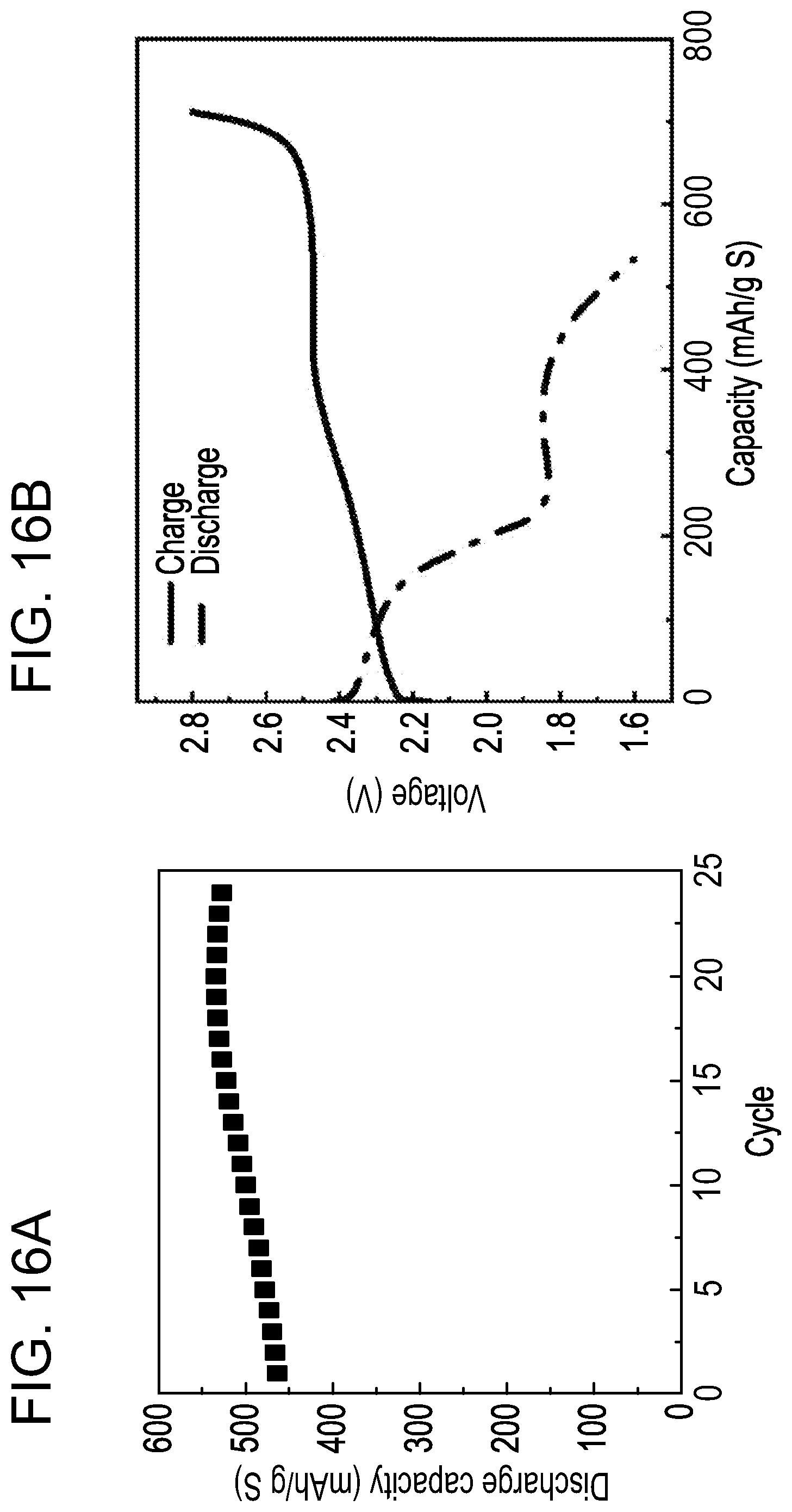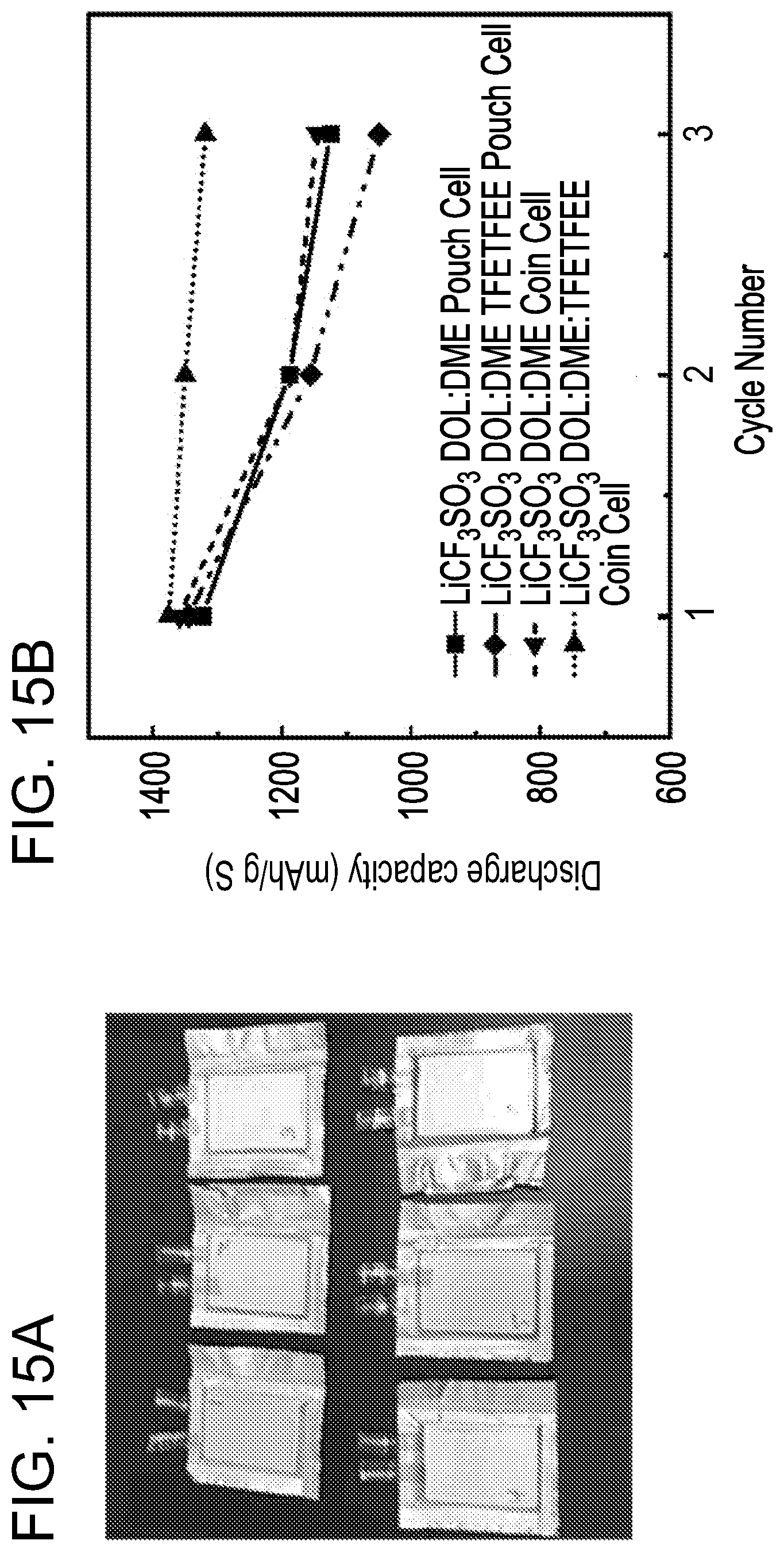Electrolyte Performance in Single Layer Pouch Cells. Single layer pouch (SLP) cells with a form factor of 3.8 cm×5.5 cm and an active area of 20 cm2were assembled, as shown in FIG. 15A. SLPs were assembled with two different types of low temperature electrolytes (LiCF3SO3in DOL:DME and LiCF3SO3in DOL:DME:TFETFEE) at an electrolyte to sulfur ratio of 8 μL/mg S. Cells were compressed between two plates to maintain contact between electrodes during cycling. Six (6) SLPs were fabricated and formation cycling was performed at room temperature. Increasing the cell size from coin cell to pouch cell format dramatically changes the wetting, compression, and current density uniformity which are all parameters that can affect cell performance. Therefore, it is important to evaluate new cell components in the pouch cell format to demonstrate scale up capabilities. As shown in FIG. 15B, gravimetric capacity at both the pouch cell and coin cell level is nearly identical for the LiCF3SO3in DOL:DME electrolyte. The demonstration of performance retention in a larger format cell indicates that the developed electrolytes can be incorporated into a practical cell without loss of performance. Pouch cells were also evaluated at −20° C. (FIG. 17). Initial cycles at the lower temperature did not exhibit the second plateau, however, after cycle 20 the second plateau was resolved resulting in stable cycling at 532 mAh/g S, as shown in FIG. 16B. 25 cycles of steady cycling at −20° C. have been demonstrated above 500 mAh/g S, as shown in FIG. 16A.