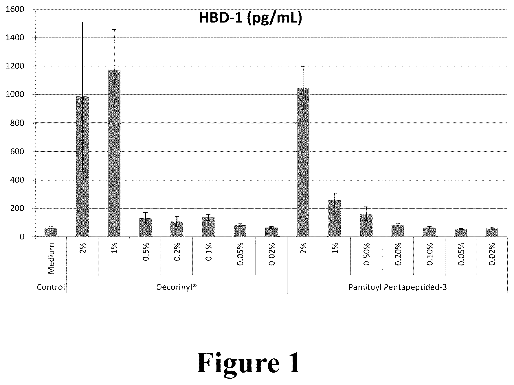 Control Medium 433 Decorinyl ® 2% 11759 1% 19652 0.5% 3058 0.2% 703 0.1% 682 0.05% 456 0.02% 226 Pamitoyl Pentapeptided-3 2% 8617 1% 4783 0.50% 2278 0.20% 775 0.10% 387 0.05% 242 0.02% 288 Example 4