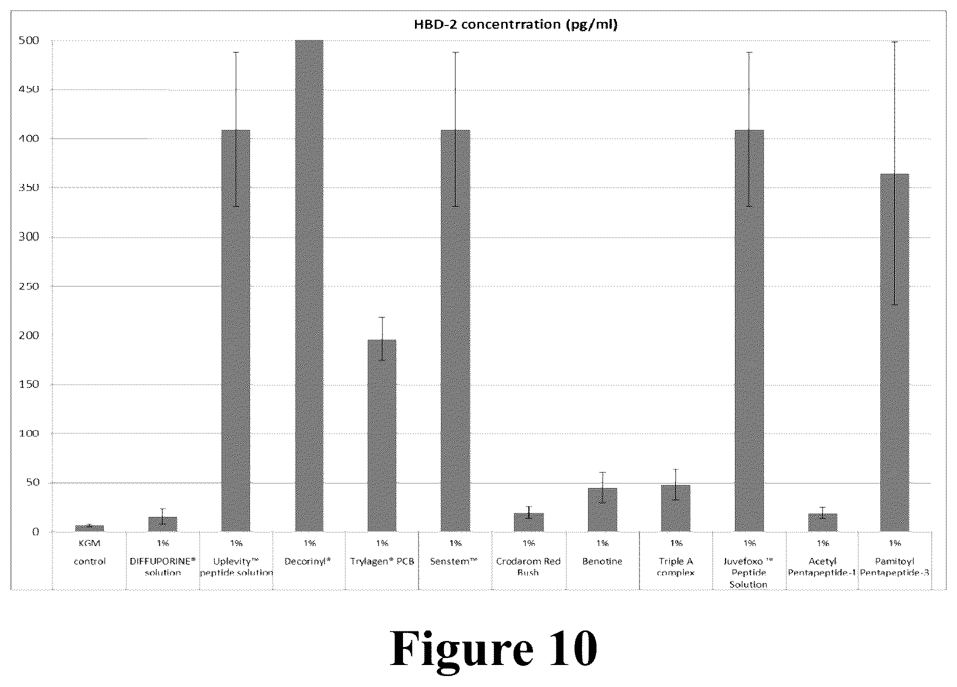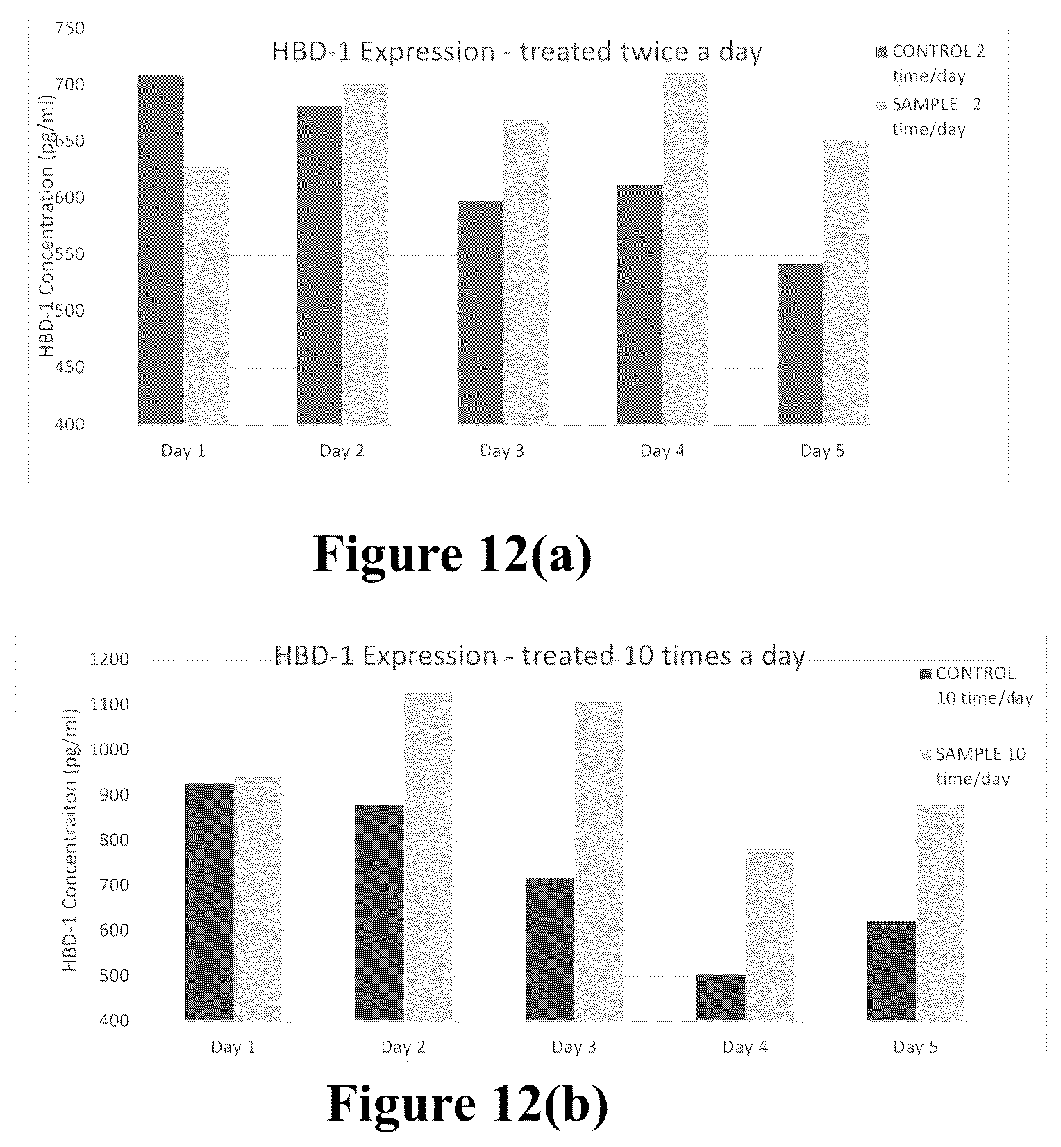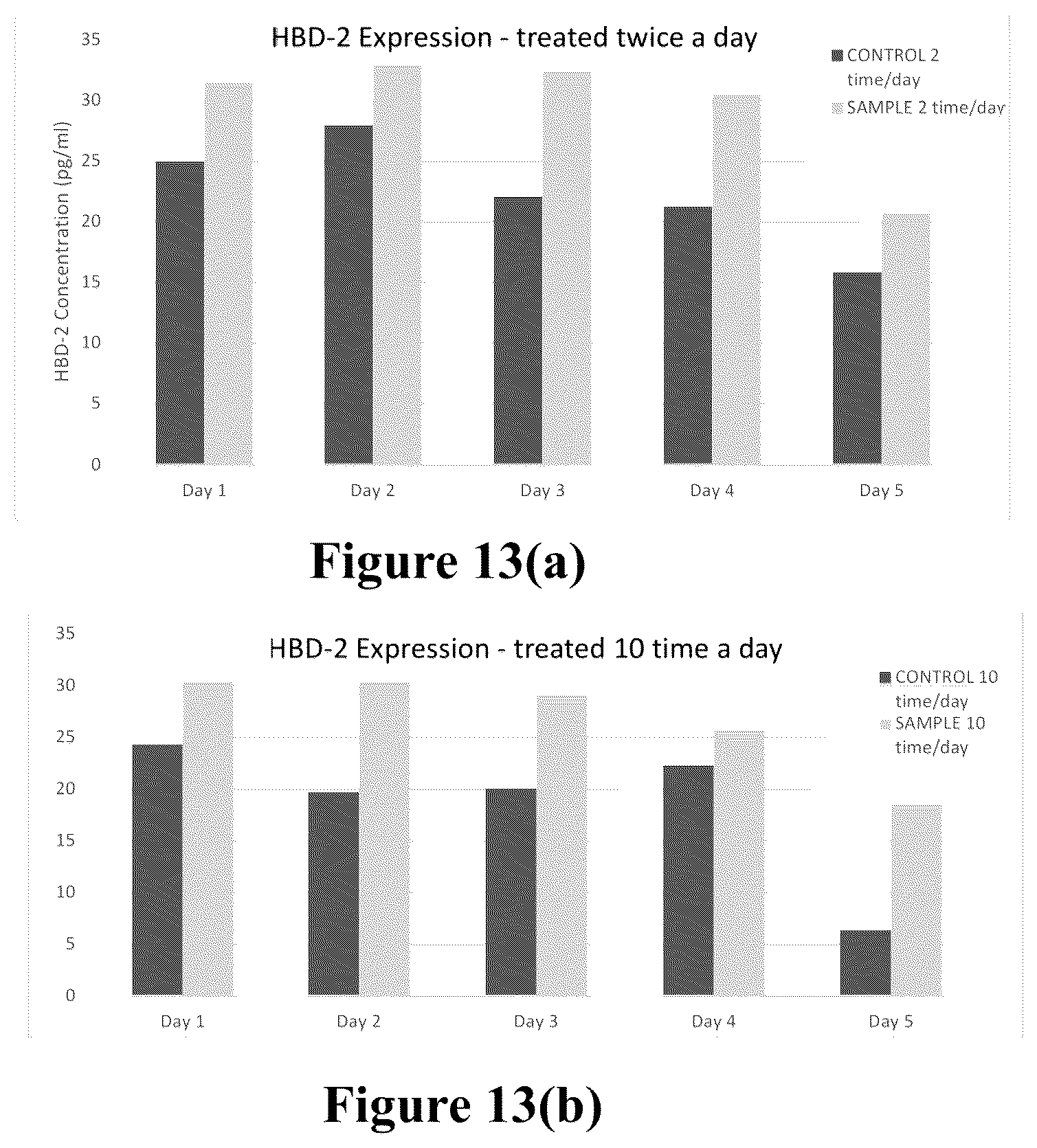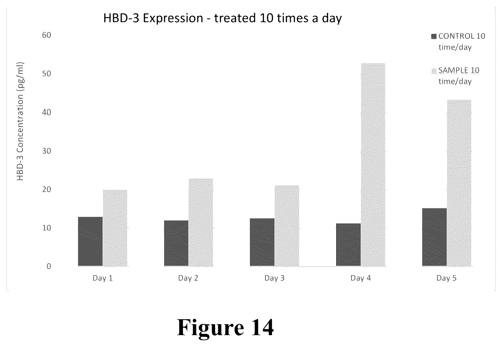 HBD-1 Concentration (pg/mL) 2-4 Upper Layers 0 days 0 0 0 5 days 4.946 0.829 0.000 10 days 11.862 15.423u 0.000 5-7 Lower Layers 0 days 0 0 0 5 days 3.385 6.834 0.000 10 days 34.98U 18.924 0.000 HBD-2 Concentration (pg/mL) 2-4 Upper Layers 0 days 0 0 0 5 days 16.937 12.121 0.000 10 days 39.856 74.995U 0.000 5-7 Lower Layers 0 days 0 0 0 5 days 8.109 6.978 0.000 10 days 48.056u 27.586 0.000 HBD-3 Concentration (pg/mL) 2-4 Upper Layers 0 days 0 0 0 5 days 63.735 64.371 0.000 10 days 172.088u 268.432U 0.000 5-7 Lower Layers 0 days 0 0 0 5 days −4.215 63.710 0.000 10 days 141.267 140.694 0.000 Example 10