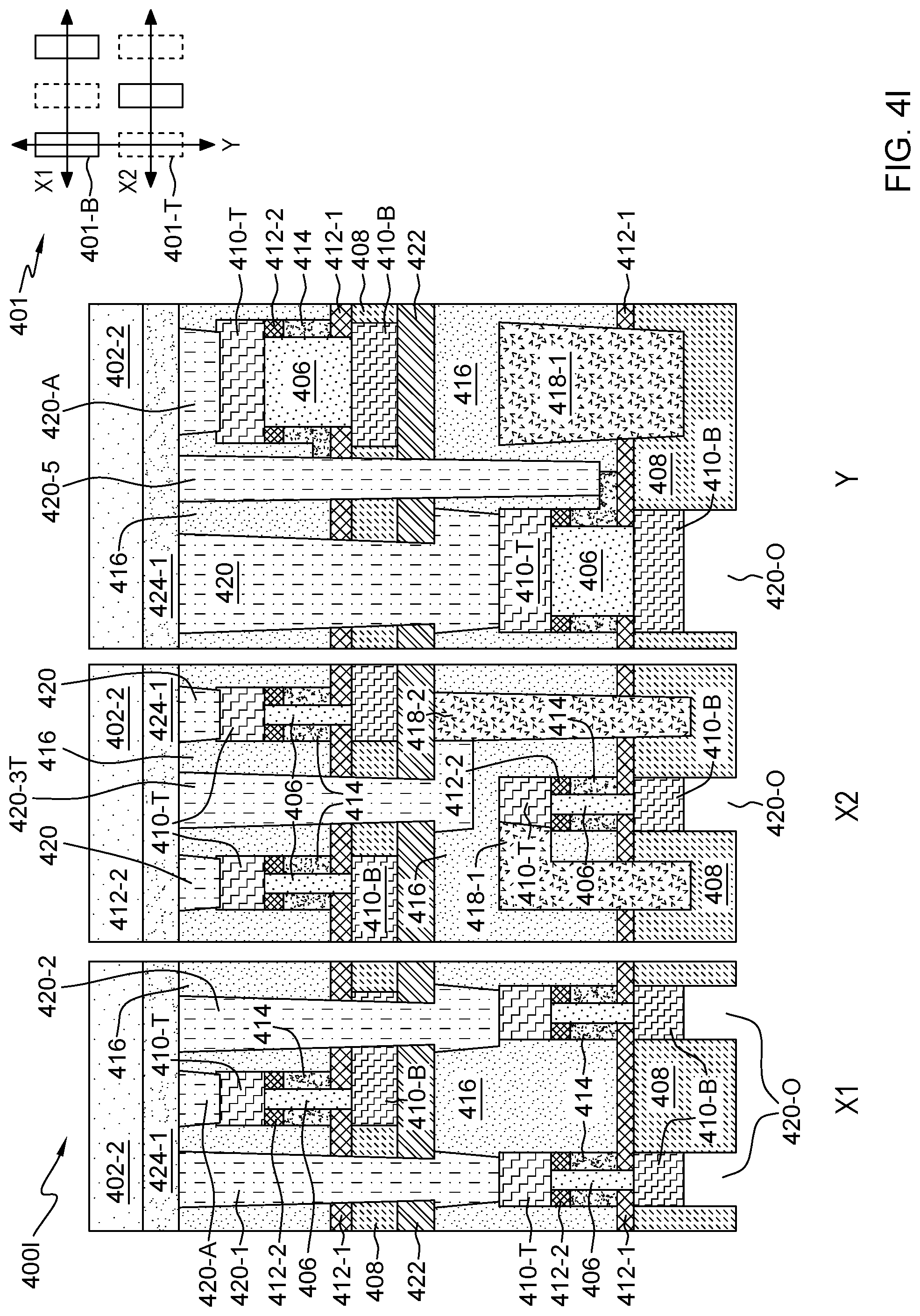 FIG. 4I is a block diagram of an example fabrication state 400I of a semiconductor device, in accordance with some embodiments of the present disclosure. In comparison to example fabrication state 400H, the X1, X2, and Y views of example fabrication state 400I no longer include the etch stop layer and silicon 406. In this way, FIG. 4I can represent the semiconductor device being fabricated after operation 318.