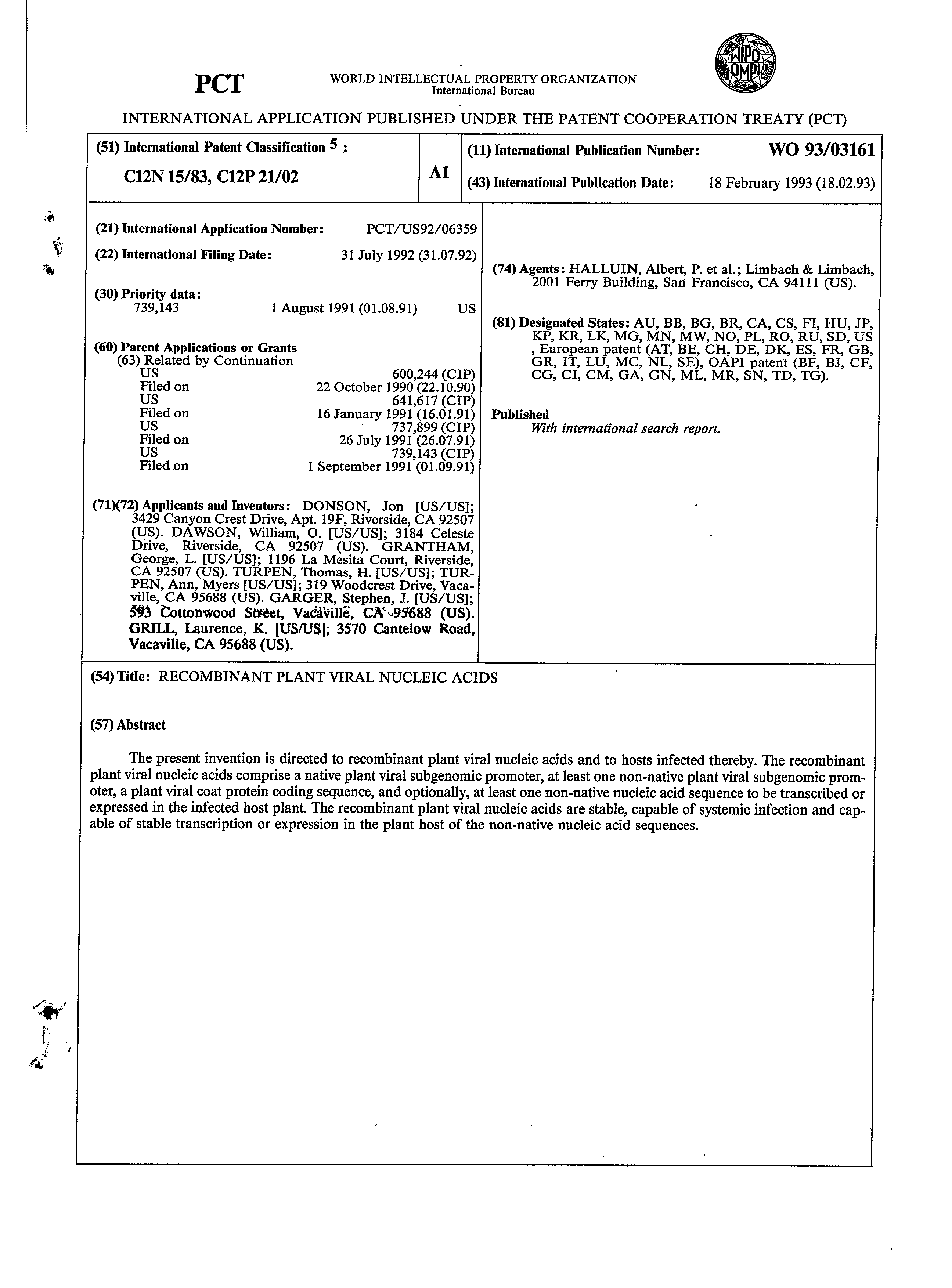 cell culture, or any group of plant cells organized into a structural and functional unit. Production Cell: A cell, tissue or organism capable of replicating a vector or a viral vector, but which is not necessarily a host to the virus. This term is intended to include prokaryotic and eukaryotic cells, organs, tissues or organisms, such as bacteria, yeast, fungus and plant tissue. Promoter: The 5'-flanking, non-coding sequence adjacent a coding sequence which is involved in the initiation of transcription of the coding sequence. Protoplast: An isolated plant cell without cell walls, having the potency for regeneration into cell culture or a whole plant. Recombinant Plant Viral Nucleic Acid: Plant viral nucleic acid which has been modified to contain nonnative nucleic acid sequences. Recombinant Plant Virus: A plant virus containing the recombinant plant viral nucleic acid. Subgenomic Promoter: A promoter of a subgenomic mRNA of a viral nucleic acid. Substantial Seguence Homology: Denotes nucleotide sequences that are substantially functionally equivalent to one another. Nucleotide differences between such sequences having substantial seguence homology will be de minimus in affecting function of the gene products or an RNA coded for by such sequence. Transcription: Production of an RNA molecule by RNA polymerase as a complementary copy of a DNA sequence. Vector: A self-replicating DNA molecule which transfers a DNA segment between cells. Virus: An infectious agent composed of a nucleic acid encapsidated in a protein. A virus may