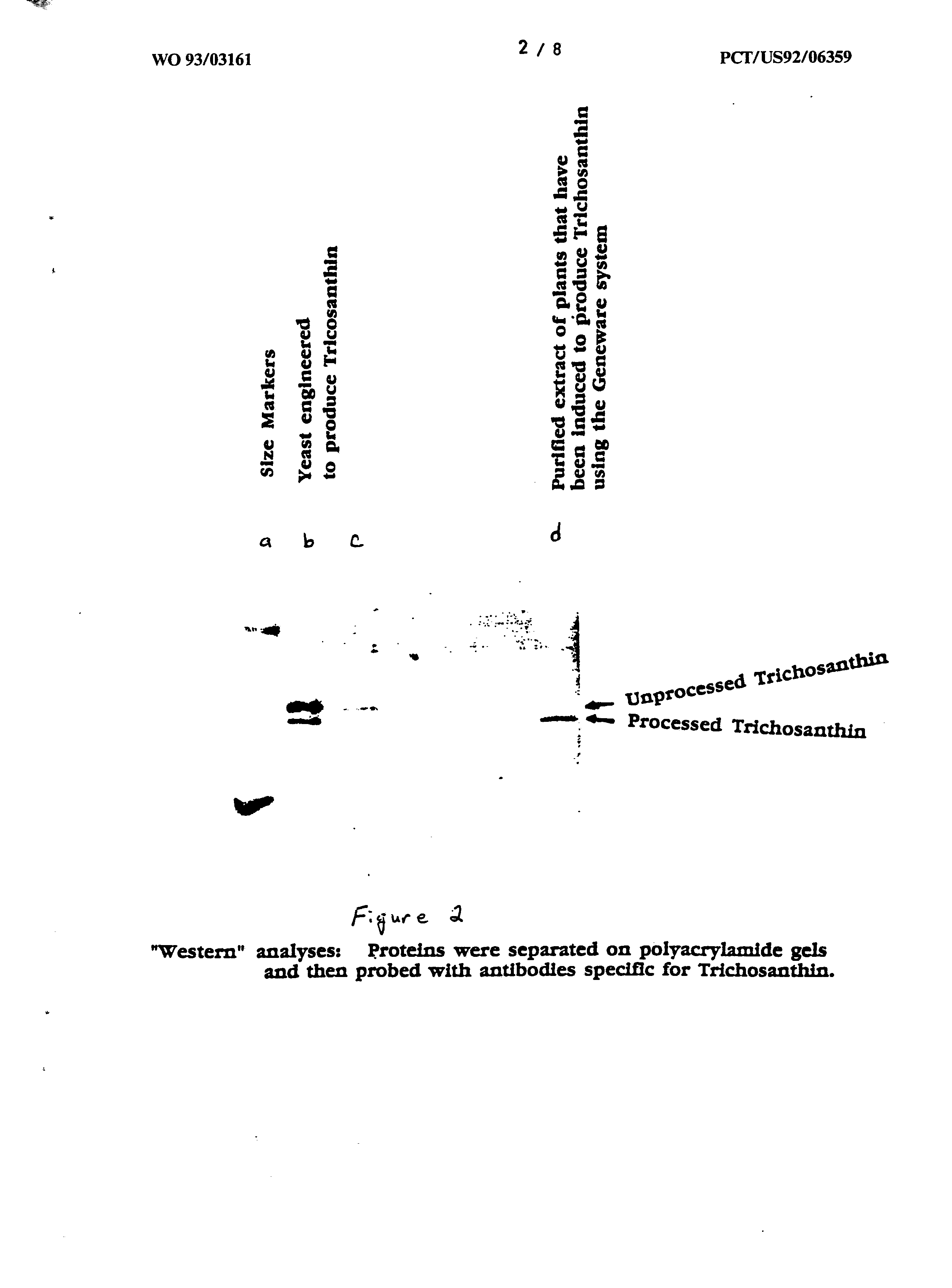 the resulting plasmid (pUC18/3 #8X) was isolated using low melt agarose gel electrophoresis, subcloned into pBluescript KS- (Stratagene, La Jolla, Calif.) and maintained in E. coli κ-12 strains C-600 and JM109. The deletion was sequenced by dideoxy termination using single-stranded templates. The deletion was determined to reside 14 bp past the rice a-amylase stop codon. Plasmid pUC18/3 #8X was digested with Hindlll, treated with mung bean exonuclease, and linkered with a Xhol oligonucleotide (5 'CCTCGAGG 3') A 1.4 Kb Xhol fragment was isolated by trough elution, subcloned into an alkaline phosphatase-treated Xhol site in pBluescript KS+, and maintained in JM109. A sequencing containing the coding sequence for human α-hemoglobin or 3-hemoglobin and transit peptide of petunia EFSP synthase is shown in SEQ ID NO: 7 or SEQ ID NO: 8, and corresponding protein sequences as SEQ ID NO: 9 and SEQ ID NO: 10, respectively. Purified protein extracts from . benthamiana treated with a recombinant plant viral nucleic acid containing the gene for α-trichosanthin, prepared in accordance with Example 1 , were separated using polyacrylamide gel electrophoresis and probed with antibodies specific for α-trichosanthin using standard procedures for Western analysis. Figure 2 is an autoradiograph of the gels which demonstrates production of processed α-trichosanthin protein in plants treated with a recombinant plant viral nucleic acid containing the gene for α-trichosanthin.