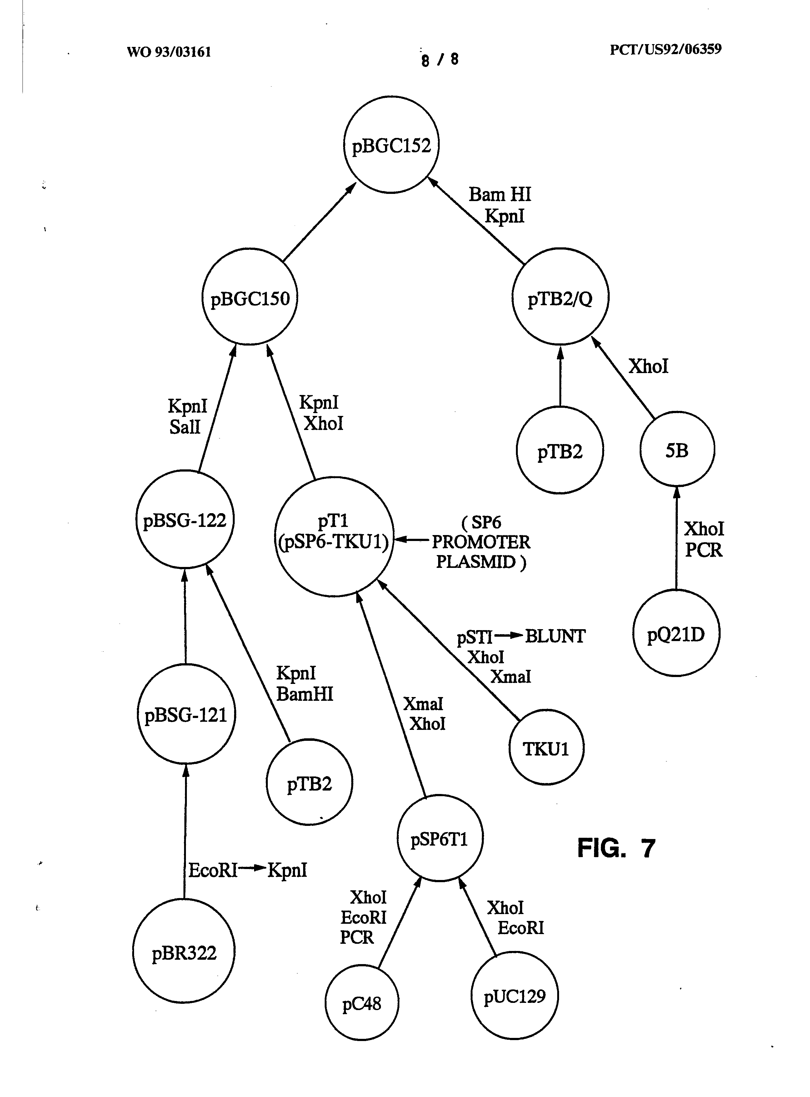 underlined. The primer was attched to a TMV subclone called pC48 (Raffo, et aJL. , Virology 184: 277-289 (1991)). The promoter was attached by PCR using the above primer and a primer complementary to TMV sequences 5673 to 5692. This amplification produced a fragment of ca. 614bp, which was then digested with Xhol and EcoRI (TMV 270) to produce a ca. 292 bp fragment which was then subcloned into similarly cut pUC129 resulting in plasmid pSP6-Tl. pSP6-Tl was cut with Xhol and Xmal (a Smal isoschizomer which cuts at TMV 256) and the resulting ca. 278 bp fragment was ligated into pTKUl (Donson, et al. Proc. Natl. Acad. Sci. U.S.A. 88:7204-7208 (1991)) which had been modified by cutting at the unique PstI site at the 5' end of the genome, blunting with T4 DNA polymerase, followed by the addition of Xhol linkers. This resulted in the infectious clone pSP6-TKUl and Xmal digested. As shown in FIG. 7, the EcoRI site in pBR322 was mutagenized to a Kpnl site using EcoRI, DNA polymerase (Klenow) , and Kpnl linkers. A Kpnl\BamHI fragment of the resulting plasmid, pBSG121, was substituted with a Kpnl\BamHI fragment of pTB2 (ATCC No. 75,280 deposited July 24, 1992). A Sall/Konl fragment of the resulting plasmid, pBSG122, was substituted with a Xhol/Kpnl fragment of pSP6-TKUI (also known as Tl) which resulted in plasmid pBGC150. A BamHI/Kpnl fragment of pBGC150 was substituted with a BamHI/-Kpnl fragment of pTB2/Q resulting in plasmid pBGC152. pTB2/Q was constructed beginning with plasmid pQ21D (ATCC No. 67907) described in Piatak, Jr., et al. U.S. Patent No. 5,128,460, the contents of which are incorporated herein by reference. The plasmid "clone 5B" containing a PCR amplified 0.88 kb Xhol fragment of the TCS sequence