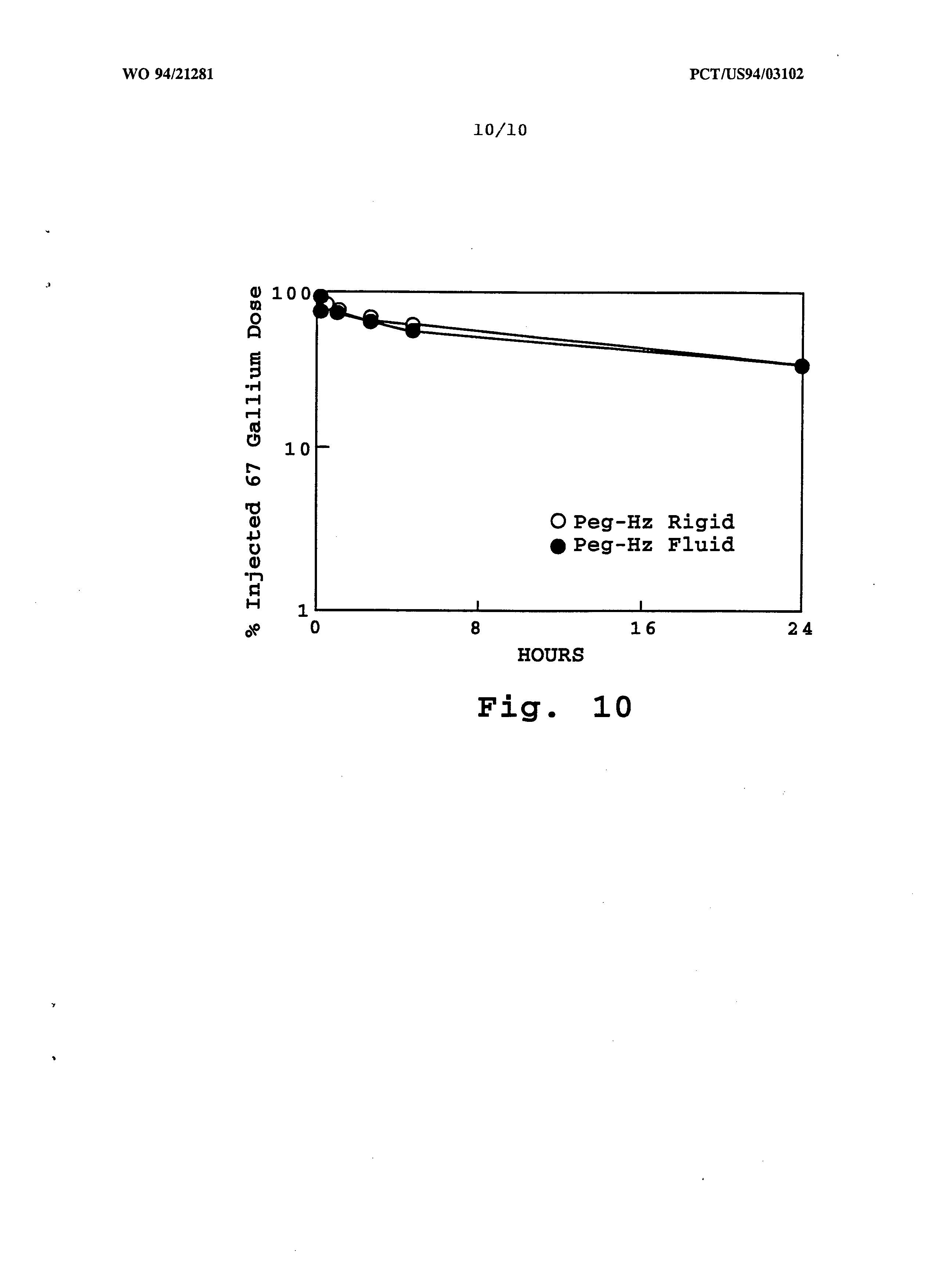 10-20 micromolar phospholipid/kg body weight. Blood sample wer obtained by retroobital bleeding at defined times. The percen of gallium labelled liposomes remaining in the bloodstream wa determined at 0, 15 minutes, l, 3, 5, and 24 hours and i presented in Table 1. The percent injected gallium 67-labelle liposome dose remaining in the blood stream at different time is illustrated in a half log plot versus time in Fig. 10. After 24 hours the animals were sacrificed and tissue removed for label guantitation. The percent of the injecte dose found in selected tissues at 24 hours is presented in Tabl 1. The blood and tissue retention of Ga-labelled, hydrazid end-functionalized liposomes having two different lipi compositions were also compared in Table 1. A fluid liposom composition was prepared from partially hydrogenated eg phosphatidylcholine (HPEPC) . A typical liposome compositio contains the hydrazide PEG-DSPE lipid, partially hydrogenate egg PC (PHEPC), and cholesterol in a lipid:lipid:lipid mol ratio of about 0.15:1.85:1. A rigid liposome composition was prepared by substituting hydrogenated serum phosphatidylcholine (HSPC) for PHEPC at the same mole ratio. As is indicated in Table 1, the fluidity of the liposome composition does not affect the blood retention time of the liposomes. However, the fluidity of the liposome composition does appear to affect the tissue distribution of the end- functionalized liposome. For example, rigid liposomes are preferentially retained by live, spleen and bone tissue. Fluid liposomes are preferentially retained by the kidneys, heart, skin and muscle tissue.