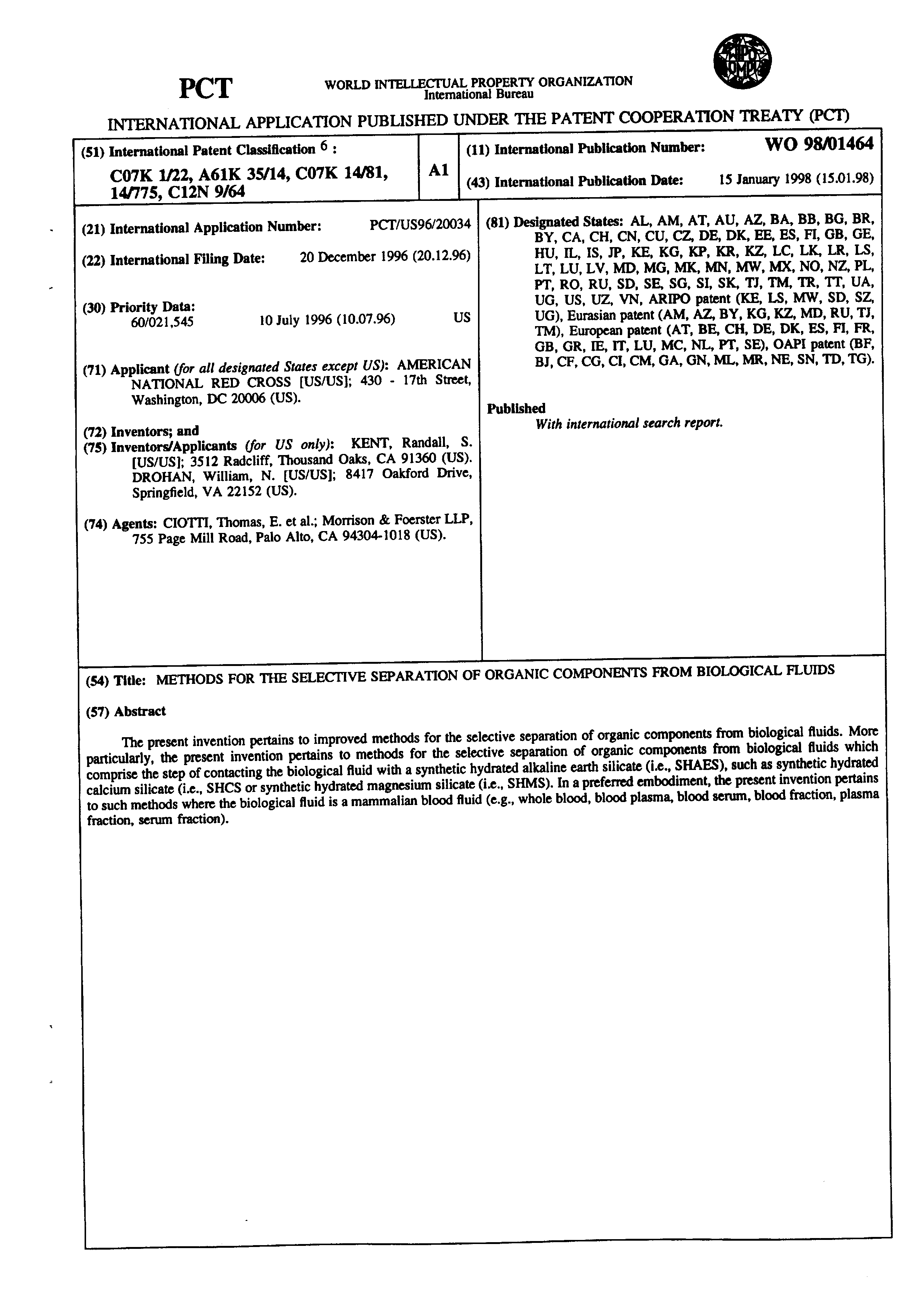 The resulting colloidal slurry is then centrifuged to remove the tricalcium phosphate and bound lipids. Yet another pre-treatment method involves the precipitation of lipoproteins from plasma by the addition of dextran sulfate (i.e., a heparin-like polysaccharide containing up to three sulfate groups per sugar residue) at a rate of about 0.1-0.5% w/v (i.e., -0.001-0.005 g/mL). The resulting lipid-rich precipitate is then removed by centrifugation. However, the clarified serum or plasma then contains dextran sulfate, and additional processing is required for its removal. The present invention provides methods for the selective separation of organic components (e.g. , lipids, lipid complexes, lipid-like materials, colloids, and components thereof) from biological fluids containing them, which methods comprise the step of contacting the biological fluid with a synthetic hydrated alkaline earth silicate (i.e., SHAES), such as synthetic hydrated calcium silicate ( .e., SHCS) or synthetic hydrated magnesium silicate (i.e., SHMS). In one embodiment, the methods of the present invention are useful as pre-treatment methods in the preparation of blood products and in the isolation and characterization of blood components derived from blood. Synthetic hydrated alkali earth silicates have been described in methods for the processing of certain liquids. For example, hydrated calcium silicate has been described in methods for the removal of colloids and color forming materials in the purification of sugar solutions (Bottoms, 1951). Hydrated calcium silicates have also been described as a sweetener for organic dry cleaning solvents to remove free fatty acids (i.e., FFA) which accumulate upon repeated usage (Riede, 1963). Compositions comprising diatomaceous earth, synthetic calcium silicate hydrate, and synthetic magnesium silicate hydrate have been described in methods for the reduction of the free fatty acid (i.e., FFA) content and color degradation in cooking oils used in fast food outlets and other restaurants (see, for example, Duensing et al. , 1978). Synthetic hydrated calcium silicates have been described as drying agents in methods for drying delactosed or deproteinized solutions obtained as by-products in the concentration of whey proteins and casein (Lauck et al, 1983). Base-treated magnesium silicates have been described as adsorbents in methods for the