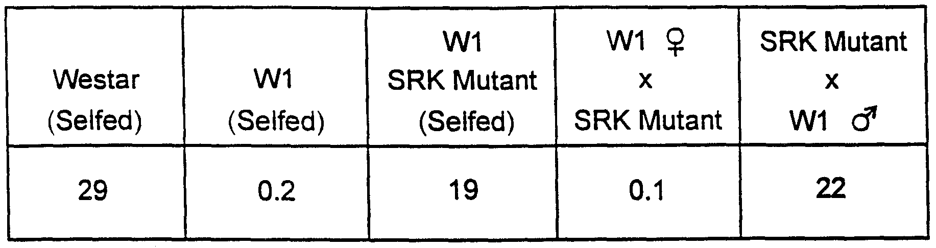 have a greater chance of altering phenotype. These chimeric genes were transformed into the self-incompatible cultivar W1 (similar to Westar and which carries the 910 allele) and the resulting transformants were analyzed for their ability to set self seed. Of the 50 transformants that were transformed with the A10-mutant SRK construct, only one showed a heritable increase in the production of self seed. Of the 15 SLR1-mutant SRK transformed lines tested, two of these showed an increase in the amount of self-seed although only one of these did so in a consistent fashion in the progeny. Therefore, one line transformed with each of the two constructs was studied further. Twenty-five self-progeny of each of the transformed lines were analyzed and in every case where the transgene was present (62/78 for the A10 mutant SRK line), the progeny set self seed while in every case where the transgene was absent the plants were SI. Therefore, the change in phenotype to SC segregated with the transgene. It is expected that other constructs targeting other alleles associated with the self- incompatibility phenotype could be developed and transformed into self-incompatible cuitivars, using the same techniques described in the previous examples and using techniques known to those skilled in the art. It is also expected that these techniques could be used for genera other than Brassica. Example 3: Phenotype of the lines transformed with the mutant SRK gene The transformed lines were analyzed for their ability to set self-seed, the level of fertility when cross-pollinated with the W1 line and the ability of the pollen to germinate and form pollen tubes. The A10-mutant SRK transformed line had virtually the same level of seed set as the SC line Westar when it was self-pollinated (Table 1). Seed pods were uniformly full for this line and with regard to self-fertilization, it was virtually indistinguishable from an SC line. When reciprocal crosses were done with the W1 line, pollen from W1 was able to fertilize the transgenic line. However, pollen from the transgenic line was rejected by the W1 line with virtually no seed set (see Table 1). An analysis of pollen germination and tube growth corresponded exactly with the seed set results with self-pollen and pollen from W1 both being able to germinate and their pollen tubes growing normally. In contrast, pollen from the transgenic line would not germinate on W1 stigmas. Therefore, only the stigma side of the SI phenotype was affected by the transgene, with no noticeable change in the
