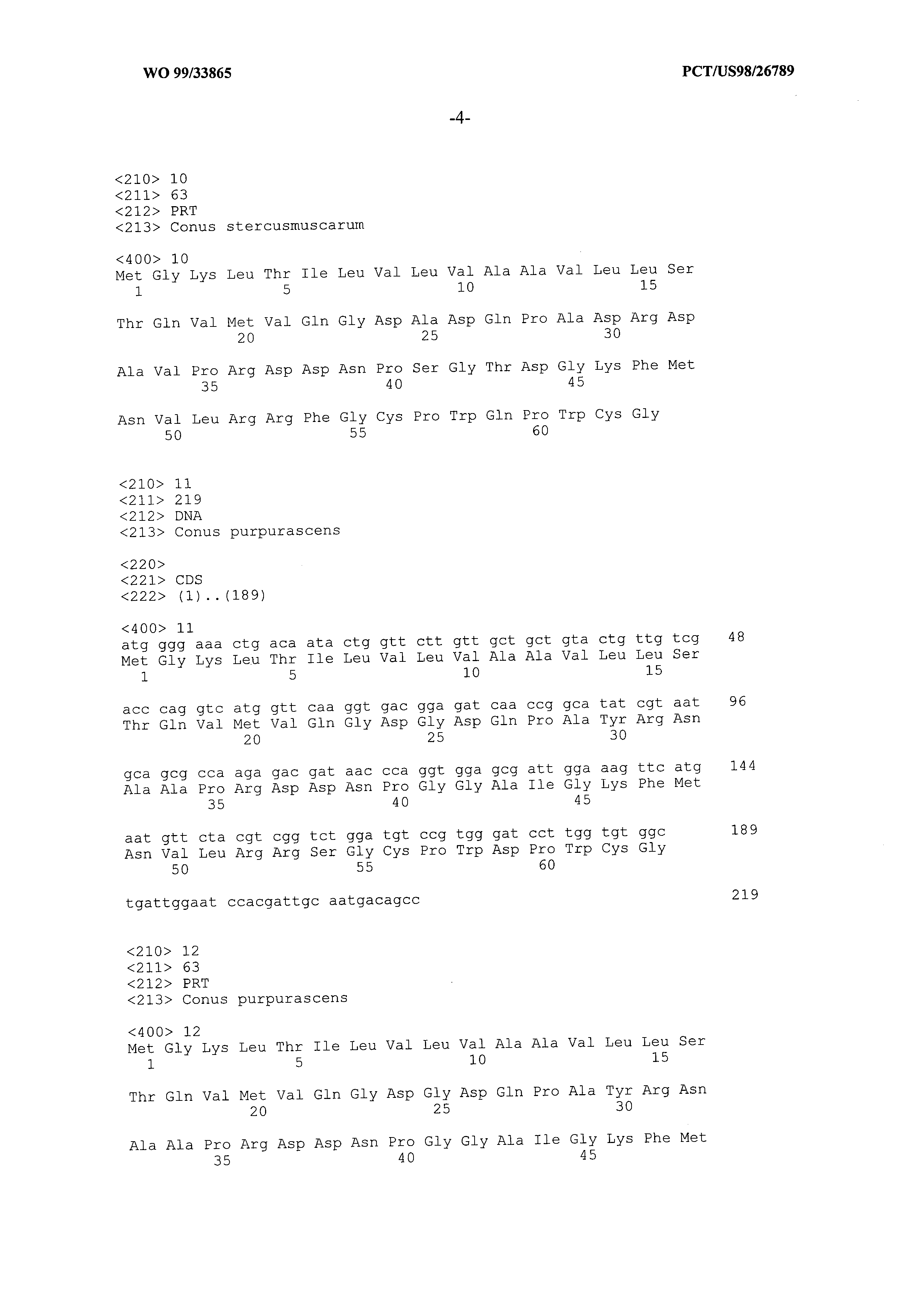 TABLE 2 Contryphan Propeptides Propeptide (Nucleic Acid) Conus sp. Propeptide Sequence SEQ ID NO: C. stercusmuscarum MGKLTILVLVAAVLLSTQVMVQGDADQPADRDAVPRDDNPSGTDGKFMNVLRRFGCPWQPWCG 10 (9) C. purpurascens con 1 MGKLTILVLVAAVLLSTQVMVQGDGDQPAYRNAAPRDDNPGGAIGKFMNVLRRSGCPWDPWCG 12 (11) C. textile conl MGKLTILVLVAVALLSTQVMVQGDGDQPADRDAVPRDDNPGGMSEKFLNALQRRGCPWQPYCG 14 (13) C. textile con2 MGKLTILVLVAAVLLSAQVMVQGDGDQPADRKAVPREDNPGGASGKLMDVLRPKKCVLYPWCG 16 (15) C. textile con3 MGKLTILVLVAAVLLSTQAMAQGDGDQPAARNAVPRDDNPDGPSAKFMNVQRRSGCPWEPWCG 18 (17) C. marmoreus MGKLTILVLVAAVLLSTQVMVQGDRDQPADRNAVPRDDNPGRARRKRMKVLNESECPWHPWCG 20 (19) C. radiatus MGKLTILVLVAAVLLSAQVMVQGDGDQPADRNAVPRDDNPGGASGKFMNVLRRSGCPWEPWCG 22 (21) The sequence for contryphan R from C. radiatus is GCX,X2EPWC, wherein X, is Pro or 4-hydroxyproline and X2 is D-Tφ or L-Tφ, preferably D-Tφ (SEQ ID NO:23). The toxin may optionally contain a G at the C-terminus, or the C may contain a carboxyl or an amide group. This peptide is disclosed in PCT/US97/20534, incoφorated -i herein by reference.