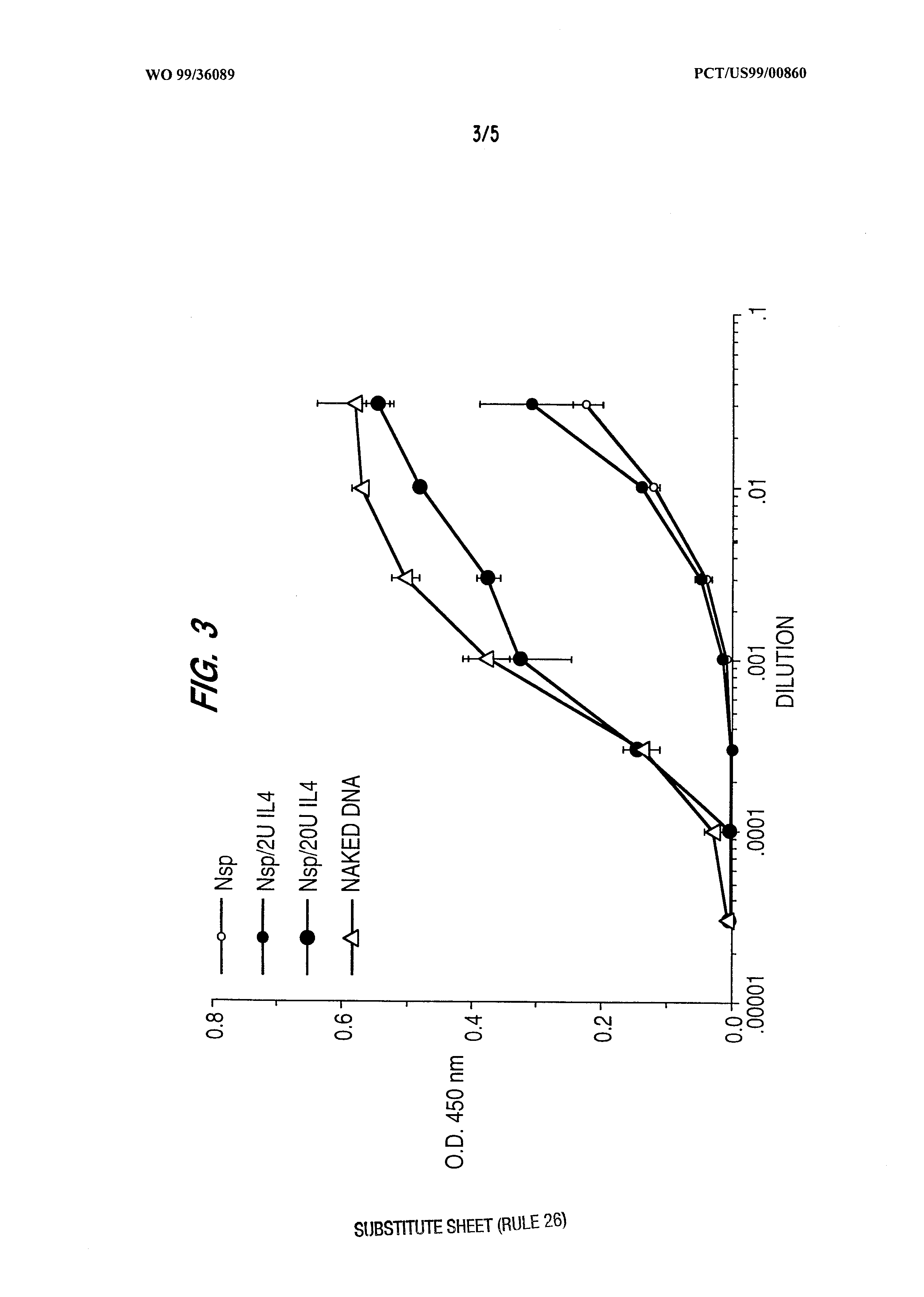 BRIEF DESCRIPTION OF THE DRAWINGS Figure 1. Proliferation of CT-4S cells in response to nanosphere-delivered IL- 4. DNA-gelatin nanospheres were synthesized with different loading levels of murine IL-4 (denoted as 0, 100, and 1000U added to the coacervating reaction), were subsequently purified, and incubated with CT-4S cells. 30 hrs. after the addition of nanospheres, the cells were labeled with3H-thymidine, then radioactivity associated with the cells was measured 18 hrs later. Nanosphere doses are indicated as total DNA. Data points are average of triplicates +/- s.d. Figure 2. Immunological effects of nanosphere-delivered IL-4. DNA-gelatin nanospheres synthesized with either 0, 1.5, 15 U IL-4 per ug p43-clacZ DNA were injected intramuscularly into groups of 4 mice every two weeks for a total of three immunizations. ELISA assays for anti-β-gal IgG antibody responses were carried out on pooled mice serum at week 4 (after two immunizations). At week 8, lymphocytes from the spleens and lymph nodes from each group were harvested, pooled, and subjected to CTL assays for anti-β-gal responses. a) Anti-β-gal antibody response, b) Anti-β-gal CTL response. The results are average of triplicates +/- s.d. Figure 3. The anti-β-gal antibody response in mice injected with IL-4 given as nanosphere-encapsulated vs. free form. Groups of 4 mice were injected i.m. with nanospheres mixed with 20 U of free IL-4,. nanospheres encapsulated with 20 U IL-4 per 1 mg p43-clacZ DNA, DNA, or DNA mixed with 20 U of free IL-4. Each group was vaccinated twice at four weeks intervals with 1 mg total DNA. At week 8, the sera from individual groups were pooled then assayed for total IgG anti-β-gal antibody. Data are average of triplicates +/- s.d. Figure 4. Potentiation of CTL responses using nanosphere-encapsulated IL-2 and γ-INF. Groups of 4 mice were injected once i.m. with 2 mg of total p43- clacZ DNA either as nanospheres, nanospheres encapsulated with IL-2 (20 U per 1 mg p43-clacZ DNA), nanospheres encapsulated with IL-2 and γ-INF