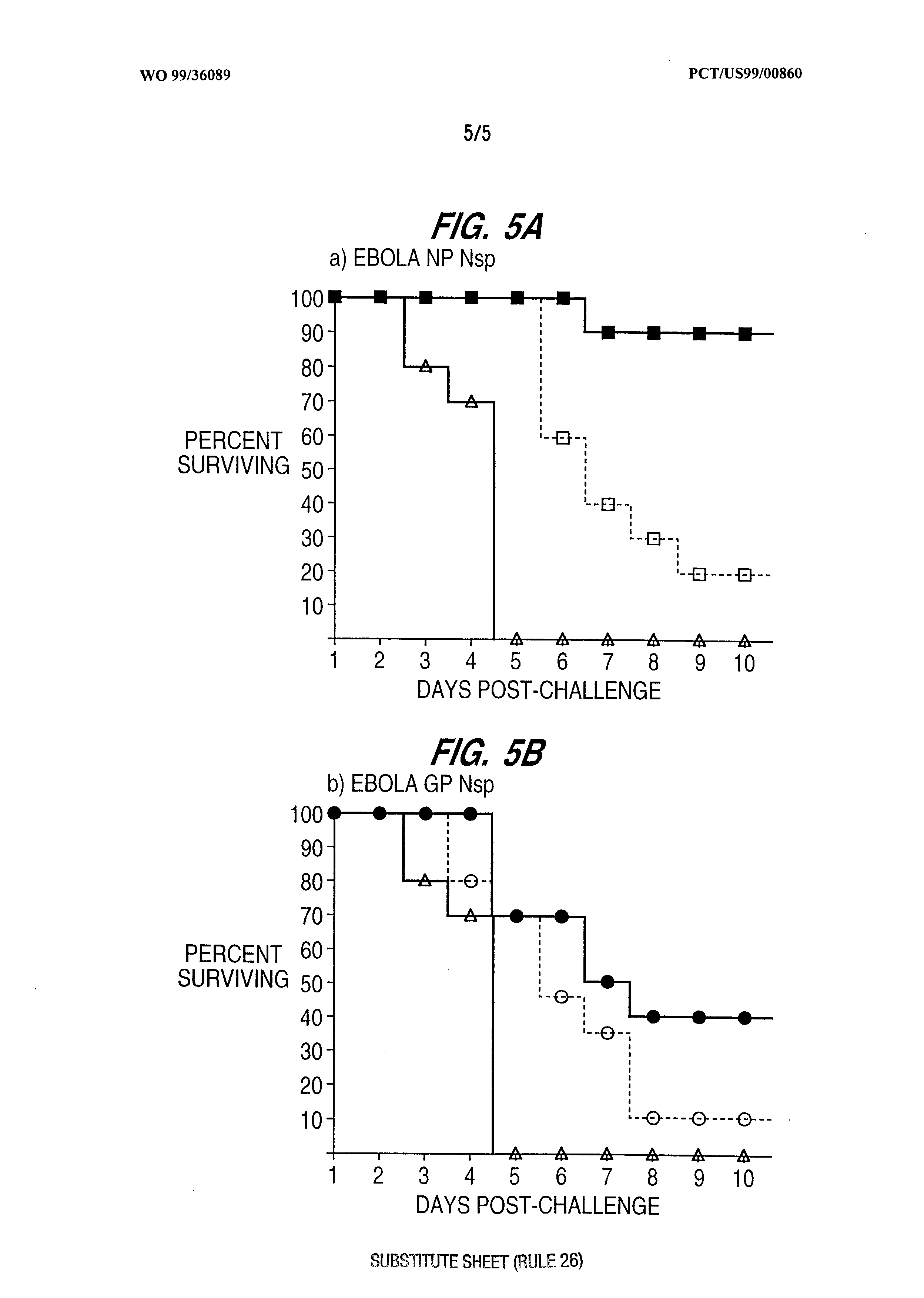 nanosphere-encapsulated LL-2 and γ-INF on the CTL responses. Mice immunized with a single injection of nanospheres containing p43-clacZ DNA alone (2 mg total DNA), with IL-2, or with IL-2 and γ-INF were examined for the generation of anti-β-gal CTL responses at week 4. Mice vaccinated with nanosphere alone or naked DNA generated poor CTL response (Fig. 4). This was consistent with our previous studies which showed at least two or three immunizations were necessary for strong CTL responses. However, when IL-2 was included in the nanospheres, an enhancement in CTL response was observed. The CTL response was potentiated synergistically when γ-INF was co-delivered with IL-2 in the nanospheres. The inclusion of both IL-2 and γ- INF in nanosphere improved the anti-β-gal CTL response from 25% lysis (at an E:T ratio of 64: 1) to at least 65% with just a single immunization. EXAMPLE 7 Protection against a lethal challenge dose of live Ebola virus in nanosphere- vaccinated mice. Ebola virus, a negative sense RNA virus, causes severe hemorrhagic fever leading to high mortality rates in infected humans. We tested the efficiency of nanosphere vaccination with DNA encoding the Ebola virus ribonucleocapsid NP protein (Ebo NP) and the envelope GP glycoprotein (Ebo GP) antigens. Previous DNA immunization studies have suggested that the protective efficacy of the Ebo NP antigen is correlated with a CTL repsonse, whereas protection assoociated with the Ebo GP antigen is associated with both strong antibody and CTL repsonses. Mice vaccinated with 0.5 or 3 μg of nanosphere DNA encoding Ebola NP or Ebola GP were challenged with 30 x LD50 of mouse-adapted live Ebola Zaire strain. The survival rate was better with each antigen than with the vector control and was significantly greater with the higher dose (p<0.01) (Fig. 5). A higher degree of protection was achieved with Ebola NP vaccination than with Ebola GP (90% vs 40%). The geometric means anti-GP or anti-NP antibody titers of immunized mice were low, 1 +/- 0.1 x 102. Vaccination with DNA nanospheres was at least as efficient as the gene gun vaccination method. A parallel challenge experiment using the NP antigen given as PowerJect-Xr™
