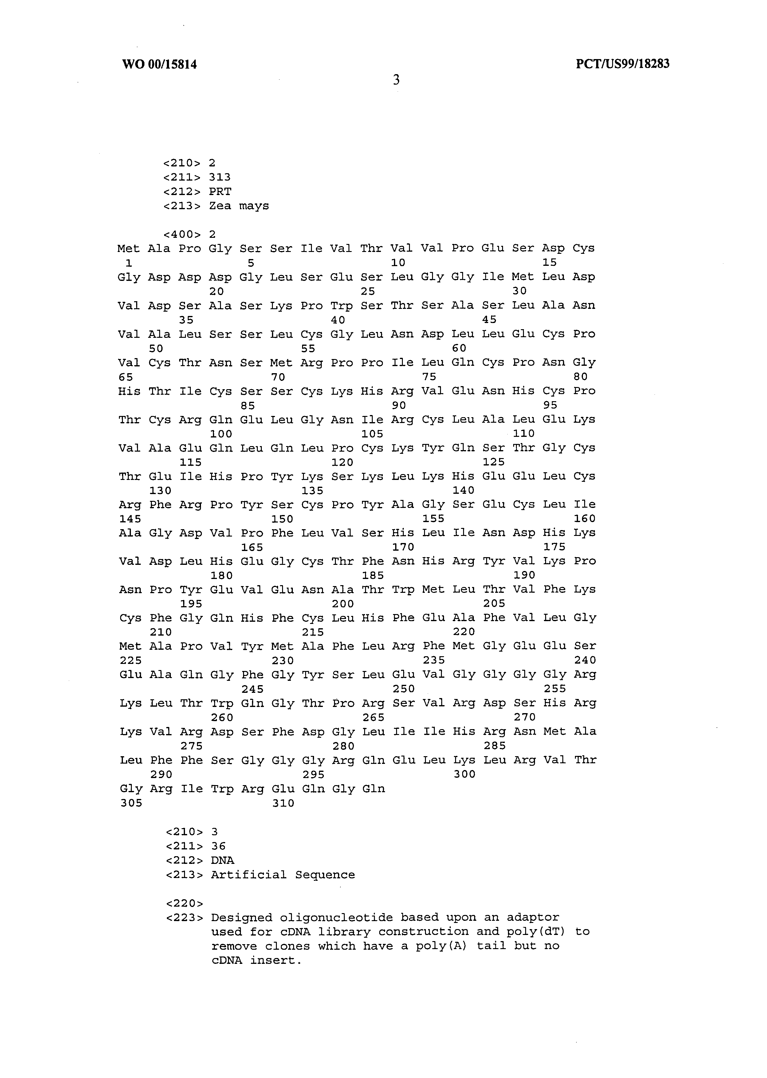 invention can also be employed for use in sense or antisense suppression of one or more genes of the present invention in a host cell, tissue, or plant. Attachment of chemical agents which bind, intercalate, cleave and/or crosslink to the isolated nucleic acids of the present invention can also be used to modulate transcription or translation. The present invention also provides isolated proteins comprising a polypeptide of the present invention (e.g., preproenzyme, proenzyme, or enzymes). The present invention also provides proteins comprising at least one epitope from a polypeptide of the present invention. The proteins of the present invention can be employed in assays for enzyme agonists or antagonists of enzyme function, or for use as immunogens or antigens to obtain antibodies specifically immunoreactive with a protein of the present invention. Such antibodies can be used in assays for expression levels, for identifying and/or isolating nucleic acids of the present invention from expression libraries, or for purification of polypeptides of the present invention. The isolated nucleic acids and proteins of the present invention can be used over a broad range of plant types, particularly monocots such as the species of the Family Graminiae including Sorghum bicolor and Zea mays. The isolated nucleic acid and proteins of the present invention can also be used in species from the genera: Cucurbita, Rosa, Vitis, Juglans, Fragaria, Lotus, Medicago, Onobrychis, Trifolium, Trigonella, Vigna, Citrus, Linum, Geranium, Manihot, Daucus, Arabidopsis, Brassica, Raphanus, Sinapis, Atropa, Capsicum, Datura, Hyoscyamus, Lycopersicon, Nicotiana, Solanum, Petunia, Digitalis, Majorana, Ciahorium, Helianthus, Lactuca, Bromus, Asparagus, Antirrhinum, Heterocallis, Nemesis, Pelargonium, Panieum, Pennisetum, Ranunculus, Senecio, Salpiglossis, Cucumis, Browaalia, Glycine, Pisum, Phaseolus, Lolium, Oryza, Avena, Hordeum, Secale, and Triticum. Nucleic Acids The present invention provides, among other things, isolated nucleic acids of RNA, DNA, and analogs and/or chimeras thereof, comprising a polynucleotide of the present invention. A polynucleotide of the present invention is inclusive of: (a) a polynucleotide encoding a polypeptide of SEQ ID NO: 2 and conservatively modified and polymoφhic variants thereof, including exemplary polynucleotides of SEQ ID NO: 1, polynucleotide sequences of the invention also include the maize SINA