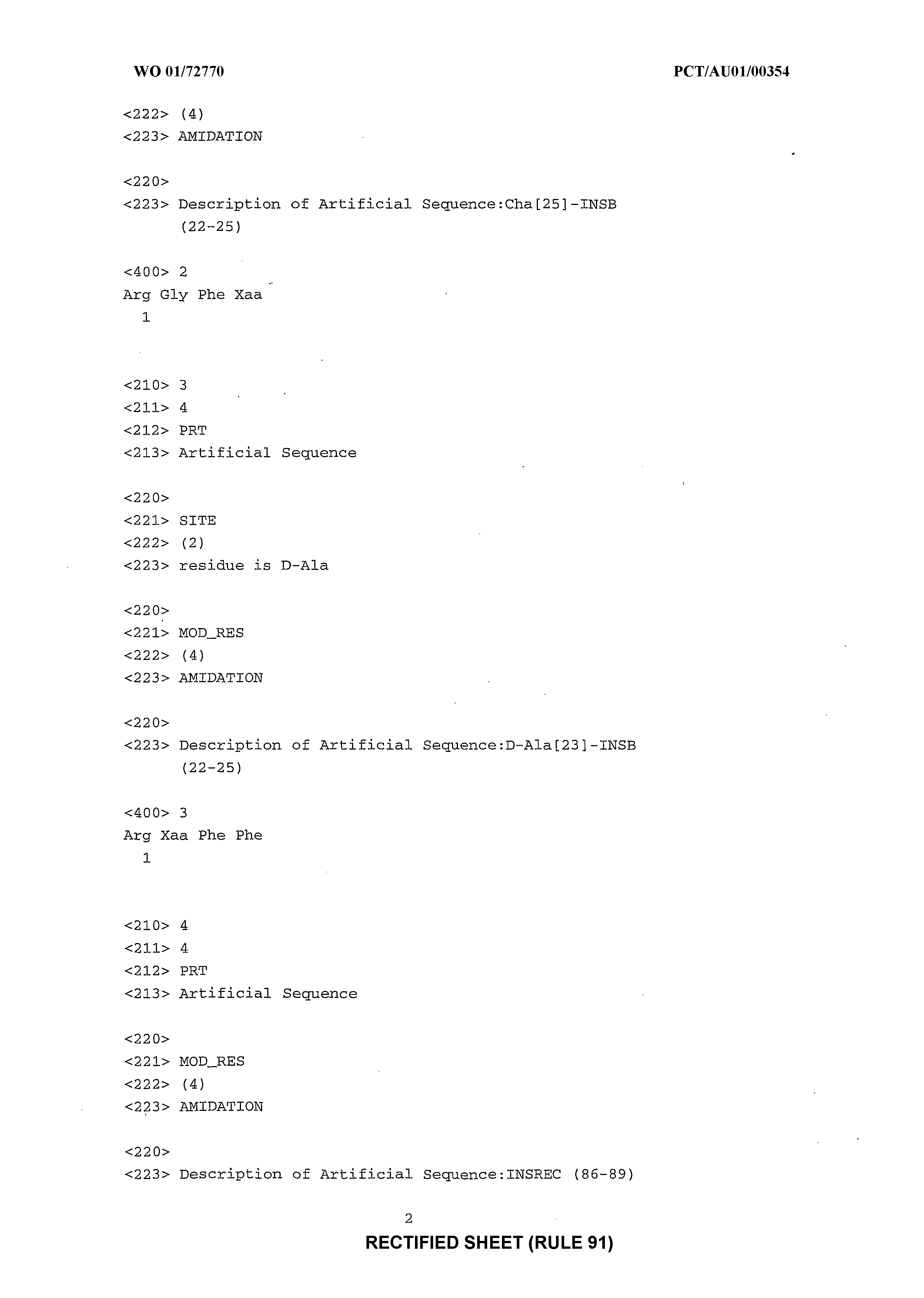 with the proviso that the peptide is not Arg-Gly-Phe-Phe, Arg-Gly-Ser-Arg-Leu-Phe-Phe-Asn-Tyr-Ala-Leu- Val, Arg-Leu-Phe-Asu-Asn-Ala, or eu-Ser-Arg-Leu-Phe-Asu-Asn- Ala. Preferably the amino acid or amino acid analogue Z is one with a cyclic side chain, such as phenylalanine, tyrosine, tryptophan, α-amino succinimide, homophenylalanine or histidine . It will be clearly understood that the sequence -X-Y-Z is a minimum sequence, and may be extended at either the N- or C-terminal, provided that the ability to potentiate insulin activity is retained. While the invention has been primarily exemplified in relation to peptides, it will also be understood that the peptide linkage between the residues may be replaced by a non- peptide bond provided that the ability to potentiate insulin activity is retained. The person skilled in the art will be aware of suitable such modifications . Sequences encompassing conservative substitutions of amino acids are also within the scope of the invention, provided that the biological activity is retained. It is to be clearly understood that the compounds of the invention include peptide amides and non-amides, and peptide analogues, including but not limited to the following: 1. Compounds in which one or more amino acids is replaced by its corresponding D-amino acid. The skilled person will be aware that retro-inverso amino acid sequences can be synthesised by standard methods; see for example Chorev and Goodman, 1993; 2. Peptidomimetic compounds, in which the peptide bond is replaced by a structure more resistant to metabolic degradation. See for example Olson et al , 1993; and 3. Compounds in which individual amino acids are replaced by analogous structures for example, geiΩ-diaminoalkyl groups or alkylmalonyl groups, with or without modified termini or alkyl, acyl or amine substitutions to modify their charge.