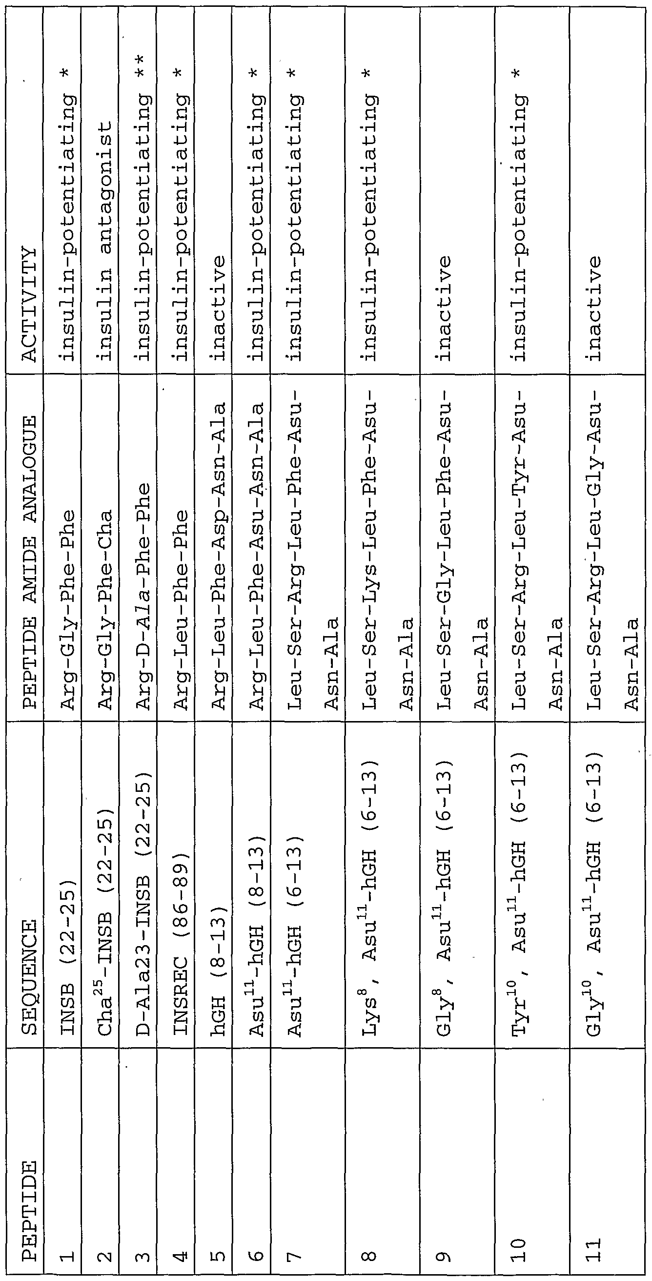 Table 4 Table 5 Sequences of synthetic peptides and activity as measured in an in vi tro glycogen synthesis assay in Zucker ( fa/ fa) rat hemidiaphragm muscle. _ o INSB: insulin B-chain INSREC: oc-subunit of the insulin receptor hGH: human growth hormone aminosuecinimide β-cyclohexyl-L-alanine ornithine