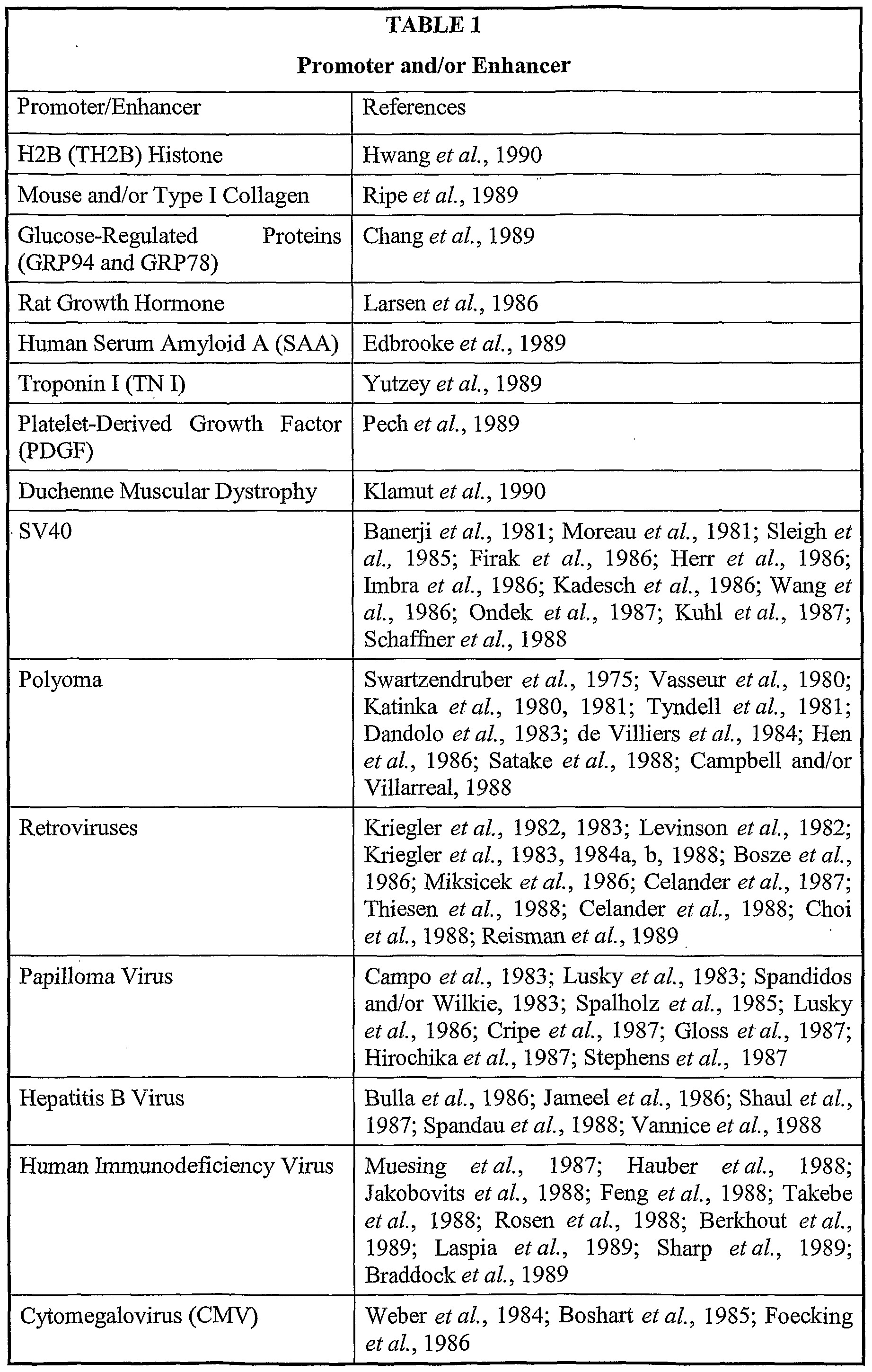 promoter and glyceraldehyde-3 -phosphate dehydrogenase can be used to obtain high-level expression of the coding sequence of interest. The use of other viral or mammalian cellular or bacterial phage promoters which are well-known in the art to achieve expression of a coding sequence of interest is contemplated as well, provided that the levels of expression are sufficient for a given purpose. By employing a promoter with well-known properties, the level and pattern of expression of the protein of interest following transfection or transformation can be optimized. Further, selection of a promoter that is regulated in response to specific physiologic signals can permit inducible expression of the gene product. Tables 1 and 2 list several regulatory elements that may be employed, in the context of the present invention, to regulate the expression of the gene of interest. This list is not intended to be exhaustive of all the possible elements involved in the promotion of gene expression but, merely, to be exemplary thereof. Enhancers are genetic elements that increase transcription from a promoter located at a distant position on the same molecule of DNA. Enhancers are organized much like promoters. That is, they are composed of many individual elements, each of which binds to one or more transcriptional proteins. The basic distinction between enhancers and promoters is operational. An enhancer region as a whole must be able to stimulate transcription at a distance; this need not be true of a promoter region or its component elements. On the other hand, a promoter must have one or more elements that direct initiation of RNA synthesis at a particular site and in a particular orientation, whereas enhancers lack these specificities. Promoters and enhancers are often overlapping and contiguous, often seeming to have a very similar modular organization. Below is a list of viral promoters, cellular promoters/enhancers and inducible promoters/enhancers that could be used in combination with the nucleic acid encoding a gene of interest in an expression construct (Table 1 and Table 2). Additionally, any promoter/enhancer combination (as per the Eukaryotic Promoter Data Base EPDB) could also be used to drive expression of the gene. Eukaryotic cells can support cytoplasmic transcription from certain bacterial promoters if the appropriate bacterial polymerase is provided, either as part of the delivery complex or as an additional genetic expression construct.