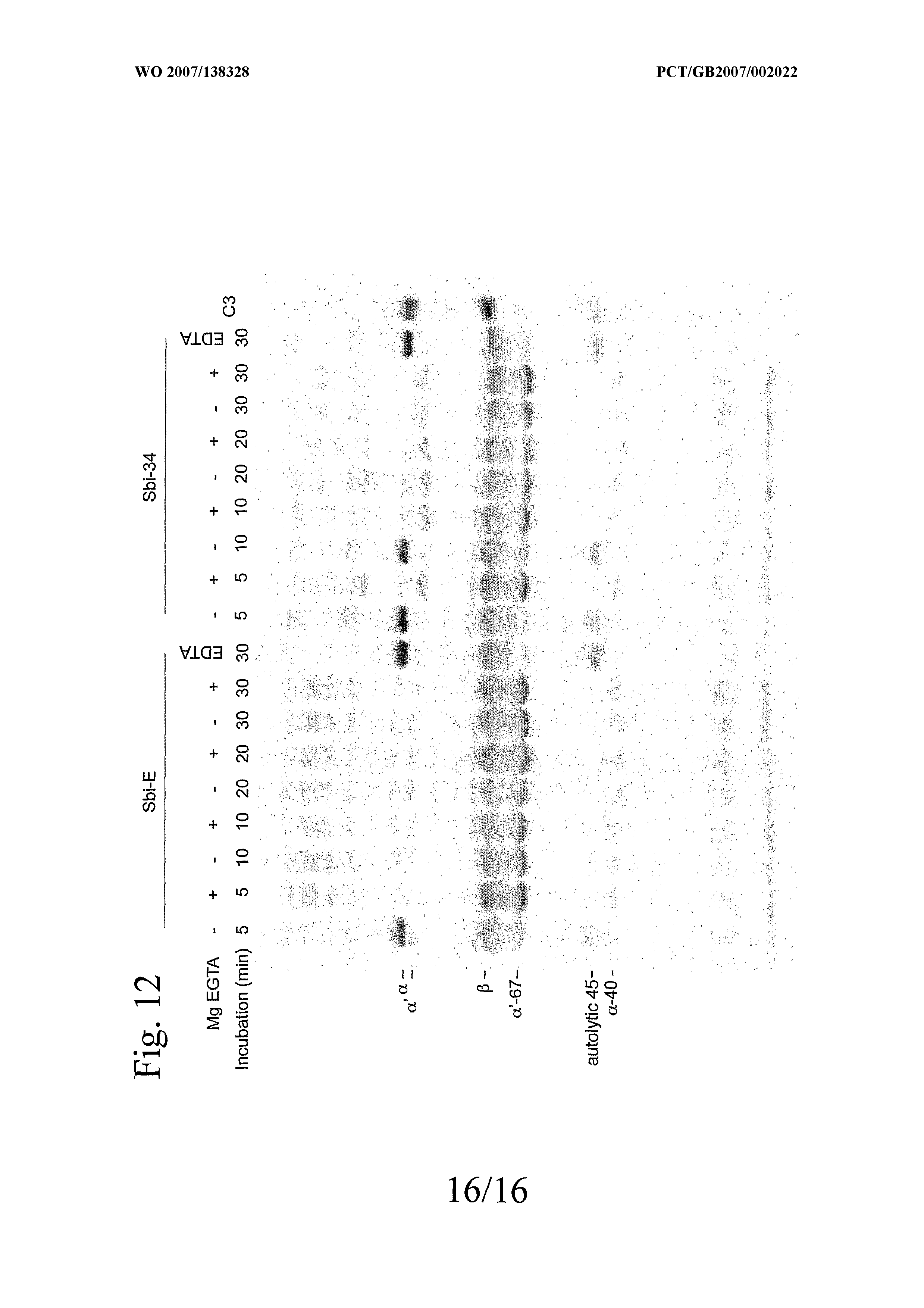 Thus in a further aspect the invention provides a method of prophylaxis or treatment of S. aureus infection, comprising administering an inhibitor of the interaction between C3 and Sbi. The invention further provides the use of an inhibitor of the interaction between C3 and Sbi in the preparation of a medicament for prophylaxis or treatment of S. aureus infection. Typically, the inhibitor will be a substance capable of binding to Sbi and inhibiting binding between Sbi and C3. For example, the inhibitor may be an antibody specific for Sbi protein and capable of inhibiting its interaction with C3. The antibody may bind to any epitope on Sbi as long as it possesses the required inhibitory activity, but will typically bind to an epitope on Sbi-III, an epitope on Sbi-IV, or an epitope on Sbi-III-IV. It may be desirable to use combinations of antibodies. For example, in certain embodiments at least a first antibody specific for Sbi-III which is capable of preventing Sbi-III binding to C3 may be administered in conjunction with a second antibody specific for Sbi-IV which is capable of preventing Sbi- IV binding to C3. The two antibodies may be administered together or separately, in the same or different compositions. The invention also provides methods by which compounds may be screened for an ability to inhibit the interaction between Sbi and C3. As described above, such compounds may have therapeutic utility in the treatment or prophylaxis of S. aureus infection. Thus in a further aspect, there is provided a method of testing a candidate compound for an ability to inhibit the interaction between Sbi and C3, comprising contacting the candidate compound with (i) C3 protein or a fragment thereof; and