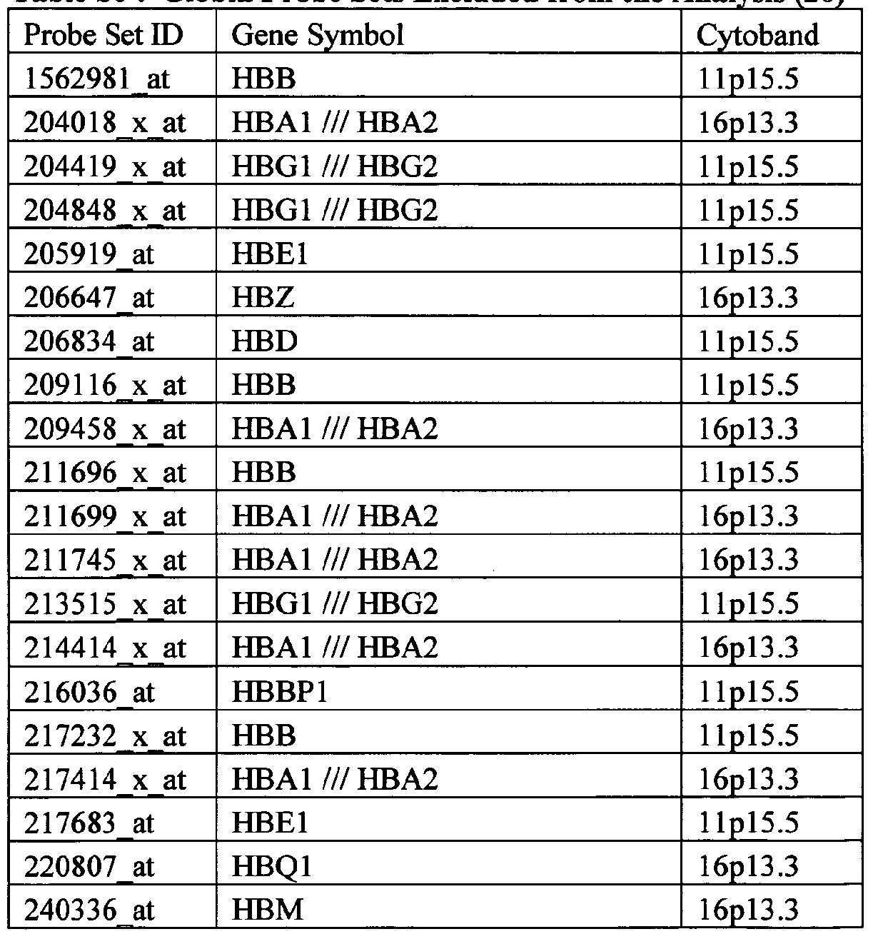 AFFX-HUMGAPDH/M33197 5 at AFFX-HUMGAPDH/M33197 M at AFFX-HUMGAPDH/M33197 3 at AFFX-HSAC07/X00351 5 at AFFX-HSAC07/X00351 M at AFFX-HS AC07/X00351 3 at AFFX-M27830 5 at AFFX-M27830 M at AFFX-M27830 3 at AFFX-hum alu at Table S6'. GIobin Probe Sets Excluded from the Anal sis 20 4. SELECTION OF CLUSTERING PROBE SETS: High CV, ROSE and COPA A. Selection of High CV Probe Sets Each of the remaining 54,504 filtered probe sets was ordered by its coefficient of variation (CV = standard devation/mean). The 254 probe sets with the highest CVs were used for the H clustering. B. Selection of COPA Probe Sets