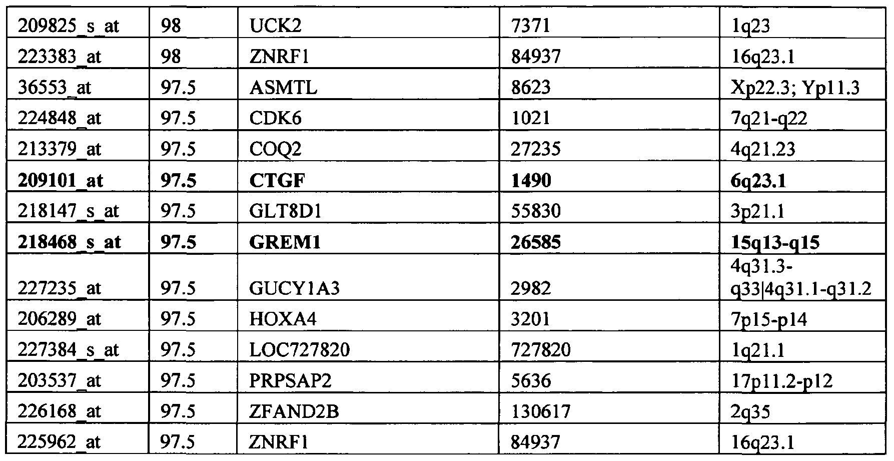 223075 s at AIFlL 9q34.13-q34.3 214255 at ATPlOA 15ql l.2 219218 at BAHCCl 17q25.3 229975_ at BMPRlB 4q22-q24 Yes R8 242579_ at BMPRlB 4q22-q24 Yes R8 201310 _s_at C5orfl3 5q22.1 200655 _s_at CALMl 14q24-q31 205467 at CASPlO 2q33-q34 200951 _s_at CCND2 12pl3 200953 _s_at CCND2 12pl3 206150_ at CD27 12pl3 R8 201028_ s_at CD99 Xp22.32; R8 YpI 1.3 201029 _s_at CD99 Xp22.32; R8 YpI 1.3 242051 _at CD99* R8 202717 _s_at CDC 16 13q34 212862 at CDS2 2Op 13 213385 _at CHN2 7pl5.3 204576 s at CLUAPl 16pl3.3 201445 _at CNN3 Ip22-p21 Yes R5 228297 _at CNN3* Yes R5 201906 _s_at CTDSPL 3p21.3 218013. _x_at DCTN4 5q31-q32 R8 222488 s at DCTN4 5q31-q32 R8 209365 _s_at ECMl Iq21 217967 s at FAM 129 A Iq25 R8 202771 _at FAM38A 16q24.3 222729 at FBXW7 4q31.3 219871 _at FLJ13197 4pl4 218084 x at FXYD5 19ql2-ql3.1 216033 s at FYN 6q21 64064_ at GIMAP5 7q36.1 229367 s at GEVLAP6 235988 _at GPRI lO 6pl2.3 Yes R8 238689 _at GPRI lO 6pl2.3 Yes R8 236489 _at GPRI lO* Yes R8 202947 s at GYPC 2ql4-q21 R4 203089 _s_at HTRA2 2pl2 208881 x at IDIl 10pl5.3 212203 x at IFITM3 I lpl5.5 R8 212592 _at IGJ 4q21 Yes R8 222868 _s_at IL 18BP I lql3 202794 at INPPl 2q32 205376 _at INPP4B 4q31.21 201656 at ITGA6 2q31.1 Yes R6 205055 at ITGAE 17pl3