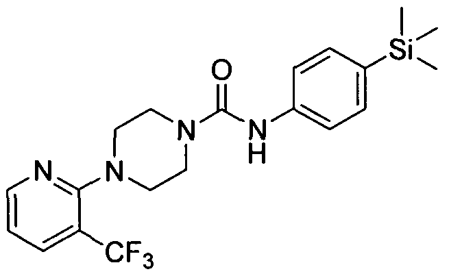 The title compound was synthesised using a procedure similar to that described for Example 1. MS: ES+ 355.2.1H NMR (400 MHz, CDCl3) δ 8.30-8.28 (m, 2H), 7.43-7.42(m, 2H), 7.34-7.33 (m,2H), 6.64-6.63 (m, 2H), 6.57 (s, IH), 3.67-3.66 (m, 4H), 3.41-3.40 (m, 4H), 0.21 (s, 9H) 2.10 Example 10 (Prepared according to Scheme 1) 4-(Pyridin-2-yl)-N-(4-(trimethylsilyl)phenyl)piperazine-l-carboxamide The title compound was synthesised using a procedure similar to that described for Example 1. MS: ES+ 354.9.1H NMR (400 MHz, DMSOd6) δ 8.41 (s, IH), 7.85 - 7.96 (m, IH), 7.30 - 7.38 (m, IH), 7.22 - 7.30 (m, 2H), 7.08 - 7.20 (m, 2H), 6.62 - 6.71 (m, IH), 6.40 - 6.50 (m, IH), 3.23 - 3.41 (m, 8H), 0.00 (s, 9H) 2.11 Example 11 (Prepared according to Scheme 1) 4-(3-Methylpyridin-2-yl)-N-(4-(trimethylsilyl)phenyl)piperazine-l-carboxamide The title compound was synthesised using a procedure similar to that described for Example 1. MS: ES- 367.1.1H NMR (400 MHz, DMSOd6) δ 8.39 (br. s., IH), 7.90 (br. s., IH), 7.21 - 7.42 (m, 3H), 7.01 - 7.21 (m, 2H), 6.73 (br. s., IH), 3.37 (br. s., 4H), 2.86 (br. s., 4H), 2.06 (br. s., 3H), 0.00 (br. s., 9H) 2.12 Example 12 (Prepared according to Scheme 1) 4-(3,5-Dichloropyridin-4-yl)-N-(4-(trimethyIsilyl)phenyl)piperazine-l-carboxamide