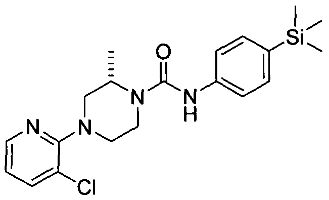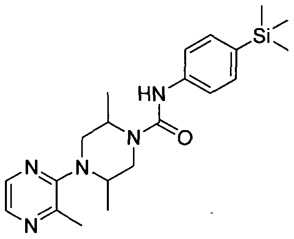 MS: ES+ 384.1.1H NMR (400 MHz, DMSOd6) δ 8.31 (br. s., IH), 8.22 (br. s., IH), 7.20 - 7.36 (m, 2H), 7.07 - 7.20 (m, 2H), 6.91 (br. s., IH), 4.25 (br. s., IH), 4.07 (br. s., IH), 3.97 (br. s., IH), 3.76 (br. s., IH), 2.91 - 3.04 (m, 2H), 2.65 - 2.85 (m, IH), 2.01 (br. s., 3H), 0.83 - 1.02 (m, 3H), 0.00 (br. s., 9H) 2.46 Example 46 (Prepared according to Scheme 5) (R)-4-(3-Chloro-5-(dimethylcarbamoyl)pyridin-2-yl)-2-methyl-N-(4-(trimethylsilyl)phenyl)piperazine-l- carboxamide Synthesised using a procedure similar to that described for Example 30 starting from (R)-5-Chloro-6-(3- methyl-4-(4-(trimethylsilyl)phenylcarbamoyl)piperazin-l-yl)nicotinic acid (Example 28). MS: ES+ 474.1.1H NMR (400 MHz, DMSOd6) δ 8.32 (s, IH), 8.02 - 8.12 (m, IH), 7.63 - 7.71 (m, IH), 7.22 - 7.32 (m, 2H), 7.12 - 7.19 (m, 2H), 4.23 - 4.30 (m, IH), 3.74 - 3.87 (m, IH), 3.55 - 3.67 (m, 2H), 2.61 2.89 (m, 9H), 1.01 - 1.11 (m, 3H), 0.00 (s, 9H) 2.47 Example 47 (Prepared according to Scheme 4) (R)-2-Methyl-4-(3-methylpyrazin-2-yl)-N-(4-(trimethylsilyl)phenyl)piperazine-l -carboxamide Synthesised in accordance with Example 23 using (R)-(+)-2-methylpiperazine to give the title compound. MS: ES+ 384.1.1H NMR (400 MHz, DMSOd6) δ 8.33 (s, IH), 7.85 - 7.94 (m, 2H), 7.22 - 7.31 (m, 2H), 7.13 - 7.19 (m, 2H), 4.20 - 4.29 (m, IH), 3.75 - 3.84 (m, IH), 3.27 - 3.36 (m, IH), 3.20 - 3.27 (m, IH), 3.02 3.07 (m, IH), 2.65 - 2.73 (m, IH), 2.53 - 2.63 (m, IH), 2.31 (s, 3H), 0.96 - 1.25 (m, 3H), 0.00 (s, 9H) 2.48 Example 48 (Prepared according to Scheme 8)