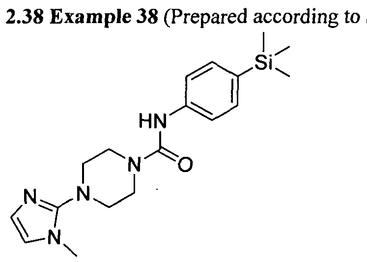 MS:ES+ 421.0.1H NMR (400 MHz, DMSO-d6) δ 8.29 (s, IH), 7.92 - 8.01 (m, IH), 7.52 - 7.63 (m, IH), 7.23 - 7.30 (m, 2H), 7.09 - 7.21 (m, 2H), 6.75 - 6.88 (m, IH), 5.00 - 5.12 (m, IH), 4.30 - 4.39 (m, 2H), 4.17 - 4.27 (m, IH), 3.71 - 3.81 (m, IH), 3.10 - 3.24 (m, 2H), 2.99 - 3.06 (m, IH), 2.69 (br. s., IH), 2.50 - 2.61 (m, IH), 1.07 - 1.15 (m, 3H), 0.00 (s, 9H) 2.37 Example 37 (Prepared according to Scheme 5 step b) Synthesised using a procedure similar to that described for Example 30 starting from (R)-2-(3-Methyl-4-(4- (trimethylsilyl)pheny lcarbamoyl)piperazin- 1 -yl)nicotinic acid (Example 35). MS: ES+ 426.1.1H NMR (400 MHz, CDCl3) δ 8.12 - 8.21 (m, IH), 7.95 - 8.08 (m, 2H), 7.20 - 7.26 (m, 2H), 7.10 - 7.17 (m, 2H), 6.84 - 6.91 (m, IH), 6.14 (s, IH), 4.17 (br. s., IH), 3.69 - 3.79 (m, IH), 3.03 - 3.29 (m, 4H), 2.79 - 2.88 (m, 4H), 1.12 - 1.24 (m, 3H), 0.02 (s, 9H) Scheme 4) 4-( 1 -Methyl- 1 H-imidazol-2-yl)-N-(4-(trimethylsilyl)phenyl)piperazine- 1 -carboxamide The title compound was synthesised using a procedure similar to that described for Example 23 starting from 1 -(I -Methyl- 1 H-imidazol-2-yl)piperazine (EP0233051) and piperazine. MS: ES+ 358.1H NMR (400 MHz, DMSO-J15) δ ppm 8.61 (s, 1 H) 7.43 - 7.50 (m, 2 H) 7.33 - 7.41 (m, 2 H) 6.86 - 6.92 (m, 1 H) 6.58 - 6.63 (m, 1 H) 3.53 - 3.62 (m, 4 H) 3.45 - 3.50 (m, 3 H) 2.91 - 3.01 (m, 4 H) 0.21 (s, 9 H) 2.39 Example 39 (Prepared according to Scheme 4)