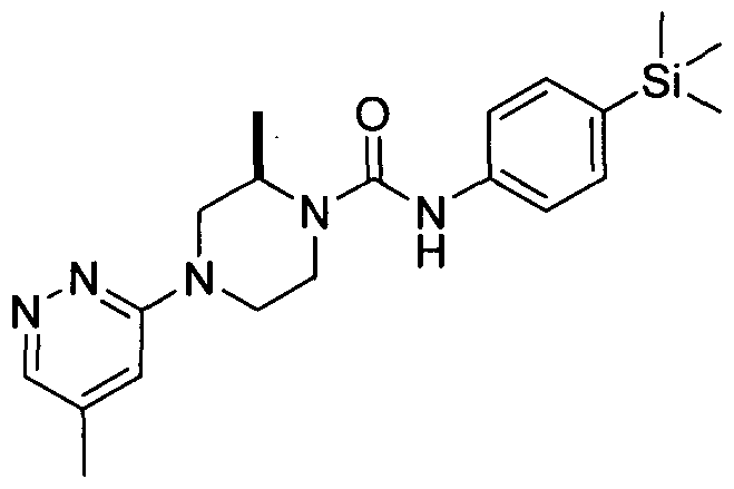 2.42 Example 42 (Prepared according to Scheme 4) (^^-(S-Fluoropyrimidin^-yO^-methyl-N^-CtrimethylsilyOphenyOpiperazine-l-carboxamide Synthesised in accordance with Example 23 using (R)-(+)-2-methylpiperazine to give the title compound. MS:ES+ 388.2.1H NMR (400 MHz, DMSOd6) δ 8.34 (s, IH), 8.15 - 8.22 (m, IH), 8.05 - 8.1 1 (m, IH), 7.22 - 7.31 (m, 2H), 7.12 - 7.20 (m, 2H), 4.14 - 4.29 (m, 2H), 3.98 - 4.07 (m, IH), 3.71 - 3.81 (m, IH), 3.13 - 3.20 (m, IH), 2.88 - 3.08 (m, 2H), 0.87 - 0.96 (m, 3H), 0.00 (s, 9H) 2.43 Example 43 (Prepared according to Scheme 7) (R)-2-Methyl-4-(4-methylpyridazin-3-yl)-N-(4-(trimethylsilyl)phenyl)piperazine-l-carboxamide A solution of (R)-4-(6-Chloro-4-methylpyridazin-3-yl)-2-methyl-N-(4-(trimethylsilyl)phenyl)piperazine- 1 - carboxamide (Example 32) (1.19 mmol) in EtOH was hydrogenated on an H-Cube hydrogenator reactor with 10% palladium on charcoal catalyst at 500C. The reaction was concentrated under reduced pressure. The resulting residue was purified by flash chromatography (0-10 % 2M ammonia in methanol in dichloromethane) yielding the title compound (0.37 mmol). MS: ES+ 384.1.1H NMR (400 MHz, DMSOd6) δ 8.50 - 8.61 (m, IH), 8.34 (s, IH), 7.22 - 7.30 (m, 2H), 7.1 1 - 7.22 (m, 3H), 4.27 (br. s., IH), 3.73 - 3.85 (m, IH), 3.36 (br. s., IH), 3.18 - 3.28 (m, IH), 3.09 - 3.17 (m, IH), 2.63 - 2.83 (m, 2H), 2.12 (s, 3H), 1.04 - 1.21 (m, 3H), 0.00 (s, 9H) 2.44 Example 44 (Prepared according to Scheme 8)