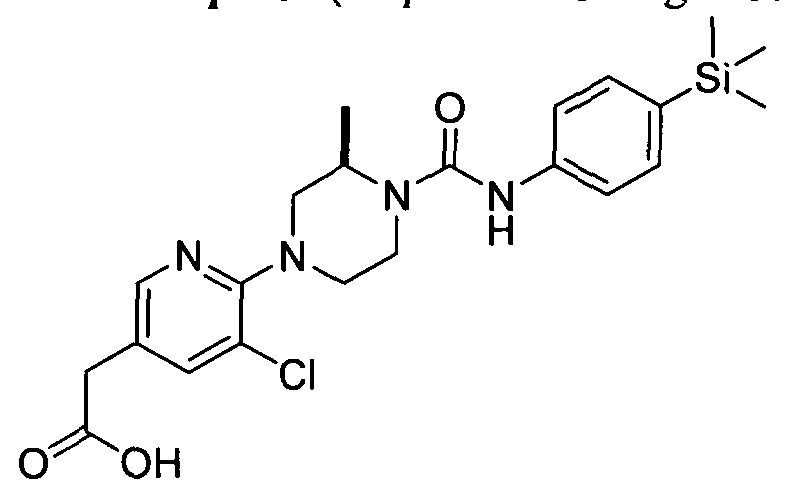 MS ES+ 387.1H NMR (400 MHz, DMSOd6) δ 8.32 (s, IH), 7.74 - 7.89 (m, IH), 7.21 - 7.41 (m, 3H), 7.07 • 7.22 (m, 2H), 6.62 - 6.77 (m, IH), 4.24 (br. s., IH), 3.69 - 3.85 (m, 2H), 3.55 - 3.64 (m, IH), 2.96 - 3.09 (m, IH), 2.81 - 2.92 (m, IH), 2.58 - 2.75 (m, IH), 0.93 - 1.09 (m, 3H), 0.00 (s, 9H) 2.27 Example 27 (Prepared according to Scheme 4) (Λ)-Ethyl 5-chloro-6-(3-methyl-4-(4-(trimethylsilyl)phenylcarbamoyl)piperazin- 1 -yl)nicotinate Synthesised in accordance with Example 23 using (R)-(+)-2-methylpiperazine. MS ES+ 475.1.1H NMR (400 MHz, DMSOd6) δ 8.43 - 8.51 (m, IH), 8.32 (s, IH), 7.85 - 7.94 (m, IH), 7.21 - 7.29 (m, 2H), 7.11 - 7.19 (m, 2H), 4.20 - 4.31 (m, IH), 4.03 - 4.15 (m, 2H), 3.73 - 3.87 (m, 3H), 3.09 - 3.16 (m, IH), 2.90 - 3.00 (m, IH), 2.72 - 2.85 (m, IH), 1.06 - 1.15 (m, 3H), 0.96 - 1.04 (m, 3H), 0.00 (s, 9H) 2.28 Example 28 (Prepared according to Scheme 5, Step a) To a solution of (R)-Ethyl5-chloro-6-(3-methyl-4-(4-(trimethylsilyl)phenylcarbamoyl)piperazin-l- yl)nicotinate (Example 27) (11.2mmol) in THF (150ml) and water (50 ml) was added potassium hydroxide (33.5mmol). The reaction mixture was stirred at ambient temperature for 60 hours. The THF was removed under reduced pressure and the resulting suspension diluted with sodium bicarbonate (sat., 150 ml) and extracted with ethyl acetate (150 ml). The aqueous was separated and acidified to pH 1 with 2N hydrochloric acid and extracted with ethyl acetate (2 xlOOml). The organics were combined, dried (MgSO4) and concentrated under reduced pressure. The resulting off white solid was triturated with methanol (cold), filtered and dried yielding the title compound in 60 % yield. MS ES+ 447.3.1H NMR (400 MHz, CDCl3) δ 8.78 - 8.86 (m, IH), 8.16 - 8.25 (m, IH), 7.42 - 7.51 (m, 2H), 7.33 - 7.40 (m, 2H), 6.47 (s, IH), 4.35 - 4.46 (m, IH), 4.06 - 4.23 (m, 2H), 3.89 - 4.01 (m, IH), 3.44 - 3.58 (m, 2H), 3.27 - 3.37 (m, IH), 3.06 - 3.20 (m, IH), 1.34 - 1.46 (m, 3H), 0.25 (s, 9H)