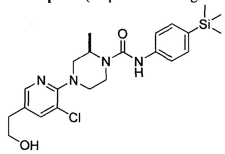 organics were combined, dried (MgSO,}) and concentrated under reduced pressure yielding (R)-4-(3-chloro-5- (2-hydroxyethyl)pyridin-2-yl)-2-methyl-N-(4-(trimethylsilyl)phenyl)piperazine-l-carboxamide (0.33mmol). MS: ES+ 447.2.1H NMR (400 MHz, CDCl3) δ 8.06 - 8.12 (m, IH), 7.54 - 7.59 (m, IH), 7.44 - 7.51 (m, 2H), 7.36 - 7.42 (m, 2H), 6.38 (s, IH), 4.31 - 4.44 (m, IH), 3.82 - 3.99 (m, 3H), 3.69 - 3.82 (m, 2H), 3.40 - 3.54 (m, IH), 3.04 - 3.13 (m, IH), 2.93 - 3.03 (m, IH), 2.76 - 2.85 (m, 2H), 1.57 (s, IH), 1.46 - 1.49 (m, 3H), 0.27 (s, 9H). 2.54 Example 54 (Prepared according to Scheme 4) (R)-4-(3-chloro-5-methylpyridin-2-yl)-2-methyl-N-(4 (trimethylsilyθphenyl)piperazine-l-carboxamide The title compound was synthesised in accordance with Example 23 using (R)-(+)-2-methylpiperazine. MS: ES+ 415.2.1H NMR (400MHz, MeOD ) δ 0 (s, 9H), 1.2 (d, 3H), 2 (s, 3H), 2.65 (t, IH), 2.75 (d, IH), 3 (s, IH), 3.4 (t, 2H), 3.8 (d, IH), 4.3 (br.s, IH), 7.1 (d, 2H), 7.2 (d, 2H), 7.4 (s, IH), 7.8 (s, IH). 2.55 Example 55 (Prepared according to Scheme 4) (R)-4-(3-chloro-5-(N,N-dimethylsulfamoyl)pyridin-2-yl)-2-methyl-N-(4-(trimethylsilyl)phenyl)piperazine-l- carboxamide. The title compound was synthesised in accordance with Example 23 using (R)-(+)-2-methylpiperazine and 5,6-dichloro-N,N-dimethylpyridine-3-sulfonamide [CAS622339-79-l]. MS: ES+ 510.1.1H NMR (400 MHz, DMSO) δ 0 (s, 9H), 1 (d, 3H), 2.45 (s, 6H), 2.8 (t, IH), 2.95 (d, IH), 3.8 (t, 3H), 4.3 (bs, IH), 7.1 (d, 2H), 7.25 (d, 2H), 7.8 (s, IH), 8.3 (d, 2H). 2.56 Example 56 (Prepared according to Scheme 4)