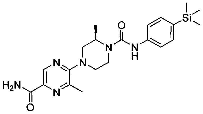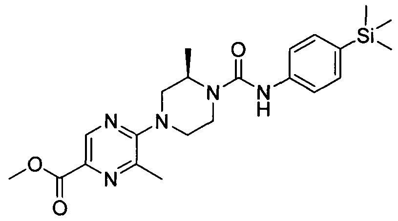 (R)-Methyl 6-methyl-5-(3-methyl-4-(4-(trimethylsilyl)phenylcarbamoyl)piperazin-l-yl)pyrazine-2- carboxylate The title compound was synthesised in accordance with Example 23 using (/?)-(+)-2-methylpiperazine and methyl S-chloro-ό-methylpyrazine^-carboxylate (CAS 77168-85-5). MS: ES+ 442.1H NMR (400 MHz, CDCl3) δ 8.78 (s, 1 H), 7.42 - 7.51 (m, 2 H), 7.33 - 7.41 (m, 2 H), 6.38 (s, 1 H), 4.31 - 4.53 (m, 1 H), 3.83 - 4.08 (m, 5 H), 3.72 (m, 1 H), 3.48 (m, 1 H), 3.30 (m, 1 H), 3.10 (m, 1 H), 2.65 (s, 3 H), 1.38 (d, J=6.82 Hz, 3 H), 0.25 (s, 9 H). 2.63 Example 63 (Prepared according to Scheme 4) (R)-6-Methyl-5-(3-methyl-4-(4-(trimethylsilyl)phenylcarbamoyl)piperazin-l-yl)pyrazine-2-carboxamide (R)-Methyl 6-methyl-5-(3-methylpiperazin-l-yl)pyrazine-2-carboxylate (0.33mmol) (prepared in Example 62) was dissolved in ammonia (2.0M in MeOH, 20 ml) and left to stand in a stoppered flask at room temperature for 4 days. The solvent was evaporated to yield (R)-6-methyl-5-(3-methylpiperazin-l- yl)pyrazine-2-carboxamide (0.33mmol). MS: ES+ 236.1H NMR (400 MHz, DMSOd6) δ 8.57 (s, 1 H), 7.77 (br. s., 1 H), 7.48 (br. s., 1 H) 3.49 - 3.77 (m, 2 H), 2.76 - 2.96 (m, 4 H), 2.43 - 2.53 (m, 1 H, under DMSO), 2.15 - 2.41 (m, 1 H) 1.01 (d, J=6.06 Hz, 3 H). The title compound was synthesised in accordance with Example 23 using (/?)-(+)-2-methylpiperazine and (Λ)-methyl 6-methyl-5-(3-methylpiperazin-l-yl)pyrazine-2 -carboxylate prepared above. MS: ES+ 427.1H NMR (400 MHz, CDCl3) δ 8.85 (s, 1 H), 7.41 - 7.56 (m, 3 H), 7.38 (d, 2 H), 6.41 (s, 1 H), 5.52 (br. s., 1 H), 4.28 - 4.53 (m, 1 H), 3.90 - 4.04 (m, 1 H), 3.76 - 3.89 (m, 1 H), 3.58 - 3.73 (m, 1 H), 3.41 - 3.57 (m, 1 H), 3.19 - 3.36 (m, 1 H), 2.96 - 3.17 (m, 1 H), 2.59 (s, 3 H), 1.40 (d, J=6.57 Hz, 3 H), 0.25 (s, 9 H).