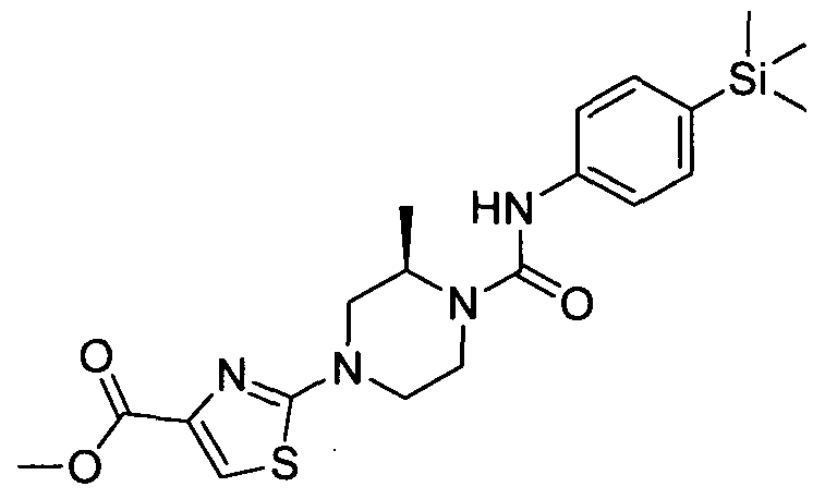 The title compound was synthesised using procedures similar to those described for Example 23 using 2- chlorothiazole. MS: ES+ 375.1H NMR (400 MHz, DMSOd6) δ 8.60 (s, IH), 7.41 - 7.51 (m, 2H), 7.32 - 7.41 (m, 2H), 7.13 - 7.21 (m, IH), 6.82 - 6.90 (m, IH), 4.48 (br. s., IH), 3.92 - 4.03 (m, IH), 3.81 - 3.91 (m, IH), 3.67 - 3.77 (m, IH), 3.16 - 3.28 (m, 2H), 2.97 - 3.09 (m, IH), 1.18 (s, 3H), 0.15 - 0.27 (s, 9H) 2.67 Example 67 (Prepared according to Scheme 4) (R)-Methyl 2-(3-methyl-4-(4-(trimethylsilyl)phenylcarbamoyl)piperazin-l-yl)thiazole-5-carboxylate The title compound was synthesised in accordance with Example 23 using (R)-(+)-2-methylpiperazine and methyl 2-chlorothiazole-5-carboxylate. MS: ES+ 433.1H NMR (400 MHz, DMSOd6) δ 8.62 (s, IH), 7.88 (s, IH), 7.42 - 7.49 (m, 2H), 7.34 - 7.41 (m, 2H), 4.44 - 4.55 (m, IH), 3.90 - 4.07 (m, 2H), 3.78 - 3.87 (m, IH), 3.75 (s, 3H), 3.41 - 3.50 (m, IH), 3.18 - 3.31 (m, 2H), 1.09 - 1.19 (m, 3H), 0.21 (s, 9H) 2.68 Example 68 (Prepared according to Scheme 4) (R)-Methyl2-(3-methyl-4-(4-(trimethylsilyl)phenylcarbamoyl)piperazin-l-yl)thiazole-4-carboxylate The title compound was synthesised in accordance with Example 23 using (R)-(+)-2-methylpiperazine and methyl 2-chlorothiazole-4-carboxylate. MS: ES+ 433.1H NMR (400 MHz, DMSOd6) δ 8.62 (s, IH), 7.75 (s, IH), 7.42 - 7.49 (m, 2H), 7.34 - 7.41 (m, 2H), 4.44 - 4.54 (m, IH), 3.95 - 4.04 (m, IH), 3.83 - 3.93 (m, IH), 3.69 - 3.79 (m, 4H), 3.20 - 3.31 (m, 2H), 3.04 - 3.15 (m, IH), 1.11 - 1.22 (m, 3H), 0.21 (s, 9H) 2.69 Example 69 (Prepared according to Scheme 5, step a)