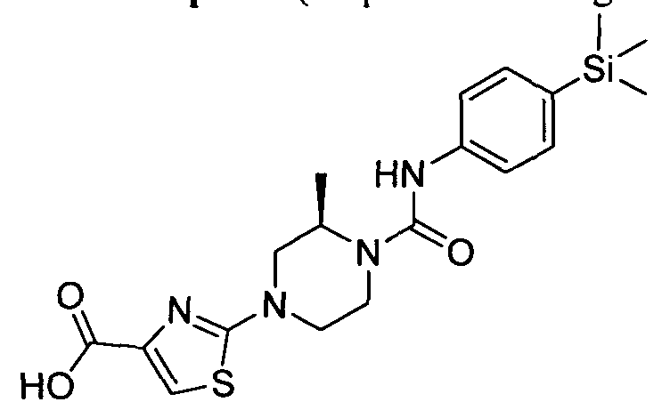 (R)-Methyl 2-(3-methyl-4-(4-(trimethylsilyl)phenylcarbamoyl)piperazin-l-yl)thiazole-5-carboxylate (Example 67) was hydrolysed to the title compound using a procedure similar to that described for Example 28. MS: ES+ 419.1H NMR (400 MHz, DMSOd6) δ 8.61 (s, IH), 7.73 - 7.79 (m, IH), 7.42 - 7.48 (m, 2H), 7.33 - 7.40 (m, 2H), 4.49 (br. s., IH), 3.88 - 4.05 (m, 2H), 3.76 - 3.86 (m, IH), 3.38 - 3.47 (m, IH), 3.16 - 3.28 (m, 2H), 1.1 1 - 1.20 (m, 3H), 0.21 (s, 9H) 2.70 Example 70 (Prepared according Scheme 5, step a) (R)-Methyl 2-(3-methyl-4-(4-(trimethylsilyl)phenylcarbamoyl)piperazin-l-yl)thiazole-4-carboxylate (Example 68) was hydrolysed to the title compound using a procedure similar to that described for Example 28. MS: ES+ 419.1H NMR (400 MHz, DMSOd6) δ 8.61 (s, IH), 7.65 (s, IH), 7.43 - 7.49 (m, 2H), 7.33 - 7.41 (m, 2H), 4.49 (br. s., IH), 3.94 - 4.04 (m, IH), 3.84 - 3.93 (m, IH), 3.68 - 3.76 (m, IH), 3.18 - 3.29 (m, 2H), 3.02 - 3.14 (m, IH), 1.14 - 1.22 (m, 3H), 0.18 (s, 9H) 2.71 Example 71 (Prepared according to Scheme 6, step a)