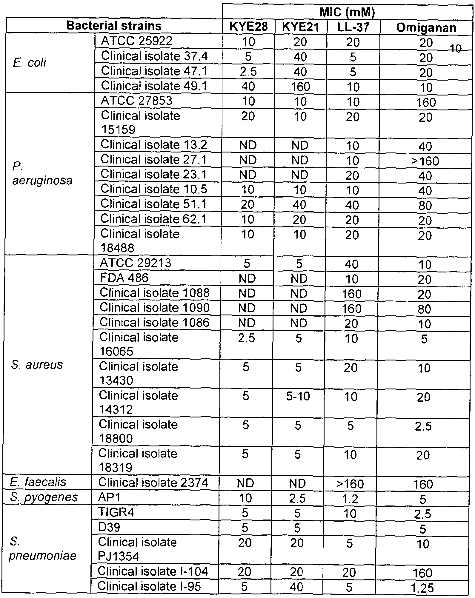 Table 1. Minimal inhibitory concentrations (MIC) of KYE28 and KYE21 against various bacterial species and isolates. LL-37 and omiganan were used as positive controls. Andersson, E., V. Rydengard, et al. (2004). "Antimicrobial activities of heparin- binding peptides." Eur J Biochem 271 (6): 1219-26. Blondelle, S. E. and K. Lohner (2000). "Combinatorial libraries: a tool to design antimicrobial and antifungal peptide analogues having lytic specificities for structure-activity relationship studies." Biopolymers 55(1): 74-87. Elsbach, P. (2003). "What is the real role of antimicrobial polypeptides that can mediate several other inflammatory responses?" J Clin Invest 111 (11): 1643- 5. Fernandez-Lopez, S., H. S. Kim, et al. (2001). "Antibacterial agents based on the cyclic D,L-alpha-peptide architecture." Nature 412(6845): 452-5. Ganz, T. (2003). "Defensins: antimicrobial peptides of innate immunity." Nat Rev Immunol 3(9): 710-20. Hancock, R. E. and H. G. Sahl (2006). "Antimicrobial and host-defense peptides as new anti-infective therapeutic strategies." Nat Biotechnol 24(12): 1551-7. Harder, J., R. Glaser, et al. (2007). "Review: Human antimicrobial proteins effectors of innate immunity." J Endotoxin Res 13(6): 317-38. Hilpert, K., R. Volkmer-Engert, et al. (2005). "High-throughput generation of small antibacterial peptides with improved activity." Nat Biotechnol 23(8): 1008-12. Hoffman, M., K. L. Loh, et al. (2003). "Localization of heparin cofactor II in injured human skin: a potential role in wound healing." Exp Mol Pathol 75(2): 109-18. Hoffman, M., C. W. Pratt, et al. (1990). "Characteristics of the chemotactic activity of heparin cofactor II proteolysis products." J Leukoc Biol 48(2): 156-62. Jenssen, H., T. Lejon, et al. (2007). "Evaluating different descriptors for model design of antimicrobial peptides with enhanced activity toward P. aeruginosa." Chem Biol Drug Pes 70(2): 134-42. Lehrer, R. I. and T. Ganz (2002). "Cathelicidins: a family of endogenous antimicrobial peptides." Curr Opin Hematol 9(1 ): 18-22. Lehrer, R. I., M. Rosenman, et al. (1991). "Ultrasensitive assays for endogenous antimicrobial polypeptides." J Immunol Methods 137(2): 167-73. Malmsten, M., M. Davoudi, et al. (2006). "Bacterial killing by heparin-binding peptides from PRELP and thrombospondin." Matrix Biol 25(5): 294-300. Malmsten, M., M. Davoudi, et al. (2007). "Antimicrobial peptides derived from growth factors." Growth Factors 25(1): 60-70. Marr, A. K., W. J. Gooderham, et al. (2006). "Antibacterial peptides for therapeutic use: obstacles and realistic outlook." Curr Opin Pharmacol. Marr, A. K., W. J. Gooderham, et al. (2006). "Antibacterial peptides for therapeutic use: obstacles and realistic outlook." Curr Opin Pharmacol 6(5): 468-472. Nordahl, E. A., V. Rydengard, et al. (2005). "Domain 5 of high molecular weight kininogen is antibacterial." J Biol Chem 280(41 ): 34832-9. Nordahl, E. A., V. Rydengard, et al. (2004). "Activation of the complement system generates antibacterial peptides." Proc Natl Acad Sci U S A 101 (48): 16879- 84. Papareddy, P., V. Rydengard, et al. "Proteolysis of human thrombin generates novel host defense peptides." PLoS Pathoq 6(4): e1000857. Pasupuleti, M., B. Walse, et al. (2007). "Preservation of antimicrobial properties of complement peptide C3a, from invertebrates to humans." J Biol Chem 282(4): 2520-8. Pasupuleti, M., B. Walse, et al. (2008). "Rational design of antimicrobial C3a analogues with enhanced effects against Staphylococci using an integrated structure and function-based approach." Biochemistry 47(35): 9057-70. Pollock, J. S., U. Forstermann, et al. (1991 ). "Purification and characterization of particulate endothelium-derived relaxing factor synthase from cultured and