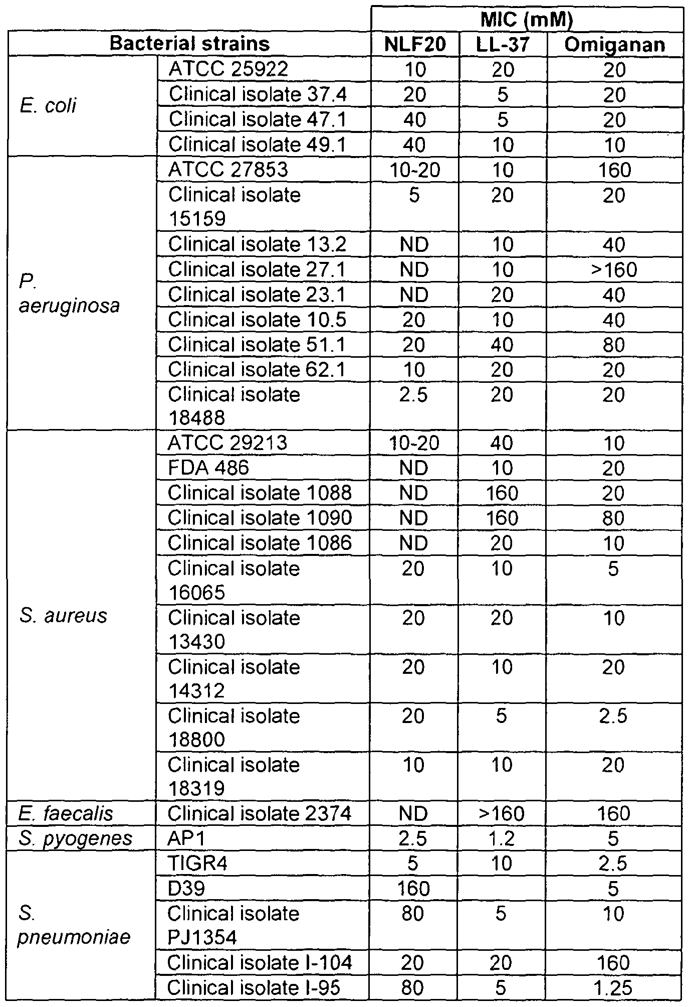 EXAMPLE C · NLF20; a novel antibiotic peptide with therapeutic potential against invasive Pseudomonas aeruginosa infection Summary In order to control microbial flora, humans as well as virtually all life forms are armoured with a rapidly acting antimicrobial system based on short cationic and amphiphilic antimicrobial peptides (AMP). Considering the increasing resistance problems against conventional antibiotics, AMPs have recently emerged as potential therapeutic candidates. Ideally, AMP should display high bactericidal potency, but low toxicity against (human) eukaryotic cells. Various strategies, such as use of combinational library approaches (Blondelle and Lohner 2000), stereoisomers composed of D-amino acids (Sajjan, Tran et al. 2001 ) or cyclic D,L-a-peptides (Fernandez-Lopez, Kim et al. 2001 ), high-throughput based screening assays (Hilpert, Volkmer-Engert et al. 2005; Taboureau, Olsen et al. 2006), quantitative structure-activity relationship (QSAR) approaches (Hilpert, Volkmer-Engert et al. 2005; Marr, Gooderham et al. 2006; Jenssen, Lejon et al. 2007; Pasupuleti, Walse et al. 2008), and identification of endogenous peptides (Papareddy, Rydengard et al. ; Nordahl, Rydengard et al. 2004; Nordahl, Rydengard et al. 2005; Malmsten, Davoudi et al. 2006; Malmsten, Davoudi et al. 2007; Pasupuleti, Walse et al. 2007) are currently employed for identifying selective and therapeutically interesting AMPs (Hancock and Sahl 2006; Marr, Gooderham et al. 2006). Infectious diseases account for millions of deaths worldwide each year and incur tremendous health care costs. The disease spectrum is broad and includes acute disease, such as erysipelas, sepsis, pneumonia and numerous other infections, having a direct association to a given pathogen, as well as chronic diseases, where microbes often cause a long-standing inflammatory state. The human pathogen Pseudomonas aeruginosa cause, and/or aggravate, a spectrum of diseases, including bacterial conjunctivitis and keratitis, otitis, postoperative and burn wound infections, chronic leg ulcers, pneumonia, and cystic fibrosis. New bactericidal agents potent against P. aeruginosa are therefore needed, and there is significant current interest in the potential use of AMPs as novel treatment modalities (Marr, Gooderham et al. 2006). However, the use of AMPs in this context is not trivial, e.g., since these bacteria are able to excrete proteolytic enzymes (Schmidtchen, Hoist et al. 2003; Werthen, Davoudi et al. 2004), as well as AMP-scavenging exopolysaccharides, as a defense against AMPs.