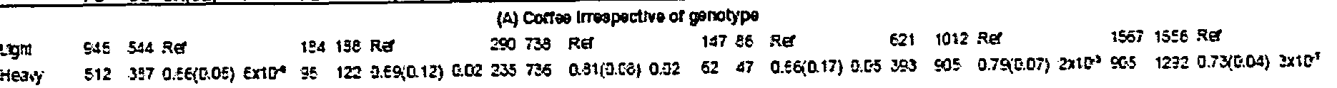 GWAIS SNP Interaction Adjusted for Case Con. OR SE P OR SE Dorninant Tea 1441 Θ20 0.83 0.12 0.19 0.49 0.1 1 2.3x10* 2.3χΐσ* Soda 1444 015 0.86 Q12 0.30 0.47 0.1 1 1.2x10* 2.3*ΐσ Tea & soda 1427 908 0.Θ5 Q12 0.27 0.48 0.1 1 1.8x10* 3.8χΐσ Additive Tea 1441 920 0.85 0.1 1 0.24 0.50 0.1 1 1.3*10* 2.ΐχΐσ Soda 1444 915 0.88 0.12 0.35 0.48 0.10 6.4x1 or* .7 ΐσ* Tea & soda 1427 90S 0.87 0.12 0.31 0.49 0.1 1 1.0x10* 3,ΐχΐσ* Stratified GV/AS Adjusted lor Case Con. Dom riant Additwe OR SE P OR SE P Heavy coffee drinker Tea 507 384 0.42 0.O8 1 .6x10 0.43 0.13 1.2x10- Soda 508 383 0.41 0.07 1 .0x10·* 0.43 0.07 7.1x10-' Tea & soda 503 380 0,42 0.08 1 .9x10* 0.43 0.08 1.4x10-* Light ooffee drinker Tea 934 536 0.83 0.12 0.20 0.85 0.11 0.24 Soda 936 532 0.86 0.13 0.30 0.88 0.12 0.35 Tea & soda 924 528 0.85 0.13 0.27 0.87 0.12 0.32 G'wen the email effect that tea and soda had on the results, we questioned if soda and tea, both of which contain caffeine, had any effect on PD risk. The amount of caffeine in an 8 oz drink is approocimately 10-30 mg in soda, 40- 120 mg in Hack tea, and 100-200 mg in drip or brewed coffee . The following is the OR and P valies for the association of tea and coffee wilh PD risk in i,a) the full GWAIS model, and (b) tested individually without coffee, SNP and interaction in the model but adjusted forage, sex and PCI and PC2. Results are consistent with an inverse association with PD in line with the caffeine content of each drink (a) PD-assodation in GWAIS model (b) PD-assodaticn adjusted for with coffee, SNP, SNP*ooffee, sex, sew age, PCI and PC2 age, PCI and PC2 in the model OR P Tea 0.81 0.03 0.80 0.02 Soda 0.89 0.29 0.87 0.20 [00220] For details on how the data on tea, soda and smoking were collected in NGRC, see [11]. [00221] GWAIS in Discovery. 81 1,597 SNP genotypes [4] and lifetime caffeinated-coffee- consumption data [1 1] from 1458 persons with PD and 931 controls from NGRC were analyzed. Applicants tested the following models: [SNP+coffee+SNP*coffee+covariate vs.