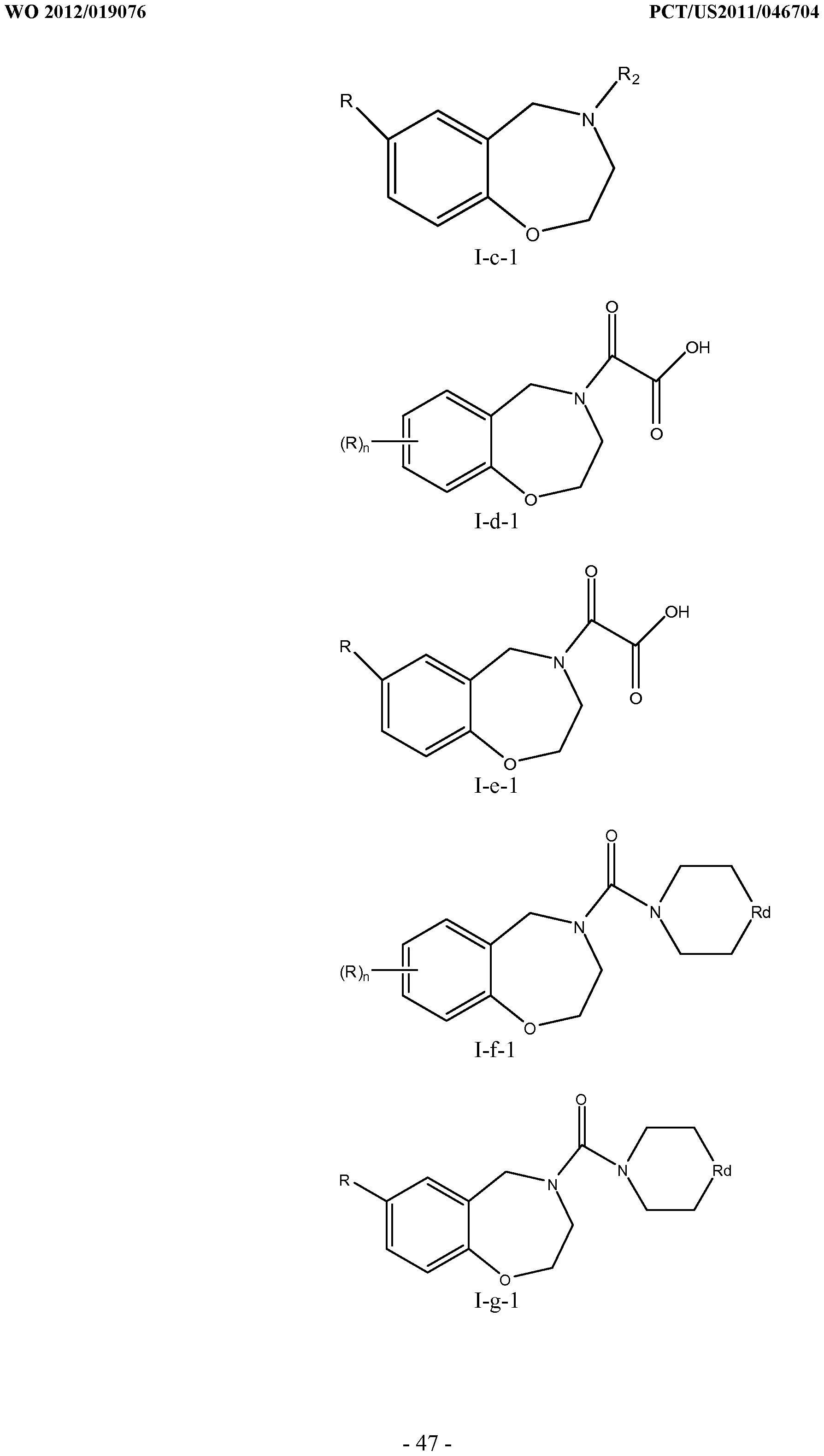 (c) R2 is C(=0)R6, wherein R6 is selected from the group consisting of -C(=0)R5, -C(=0)OR5, -C(=0)NRi3Ri4, and (CH2)bNRi3Ri4, wherein b=0, and Ri3 and Ri4 are -N R, either each H or are bonded to make ' , wherein Rd is O, CH2, or NRa; and Ra is H, alkoxy, C(=0)OC(CH3)3, or (Ci-C6 alkyl)-aryl, wherein the aryl is a disubstituted phenyl or a benzo[l,3]dioxo-5-yl group, and wherein the nitrogen in NRa may optionally be a quaternary nitrogen; or (d) R2 is R5 or (CH2)mRi0, wherein Rio is selected from the group consisting of R5, -C(=0)N(R5)2, -(C=0)OR5, or -OR5; and m is 1, 2, 3, 4, 5, or 6. More preferred compounds of (a) include Rg and R9 being independently OR5. Also in (a)-(d), more preferred compounds of (a)-(d) include each R5 being independently hydrogen, or an unsubstituted or substituted alkyl, alkylaryl, aryl, or heterocyclyl. The preferred compounds of the invention specifically include those of formula I-a-1, wherein n is 1 and R is OR5, OCZ3, Z, CN, R5, N(R5)2, -C(=0)N(R5)2, -C(=0)OR5, or -P(=0)(OR5)2, N02 at position 6, 7 or 8 of the benzoxazepine ring; or n is 2, each R is independently OR5 at positions 7 and 8 of the benzoxazepine ring. The more preferred compounds of the invention specifically include those of formula I-a-1, wherein: A) n is 1 , R is OR5 or OCZ3 at position 7 of the benzoxazepine ring, and R2 is (i) hydrogen; (ii) R5, (iii) (CH2)mRi0, wherein m is 1, 2, 3, 4, 5, or 6, and wherein Rio is R5 or (C=0)OR5; (iv) -C(=0)C(=0)OR5; (v) -C(=0)NRi3Ri4 or (vi) -C(=0)C(=0)NRi3Ri4, wherein N Rd Ri3 and Ri4 are either each H or are bonded to make \N ' / , wherein Rd is CH2, NH, O, N-benzo[l,3]dioxo-5-yl, or N-C(=0)OC(R5)3, wherein the nitrogen in Rj may optionally be a quaternary nitrogen; or R2 and R3 together with the nitrogen and carbon to which they are respectively attached, form an unsubstituted or substituted heterocycle other than a piperazine; or B) n is 1, R is Z, CN, R5, N(R5)2, -C(=0)N(R5)2, -C(=0)OR5, or -P(=0)(OR5)2 at position 7 of the benzoxazepine ring, and R2 is R5; or