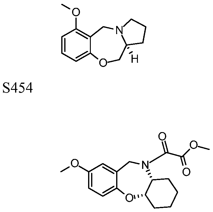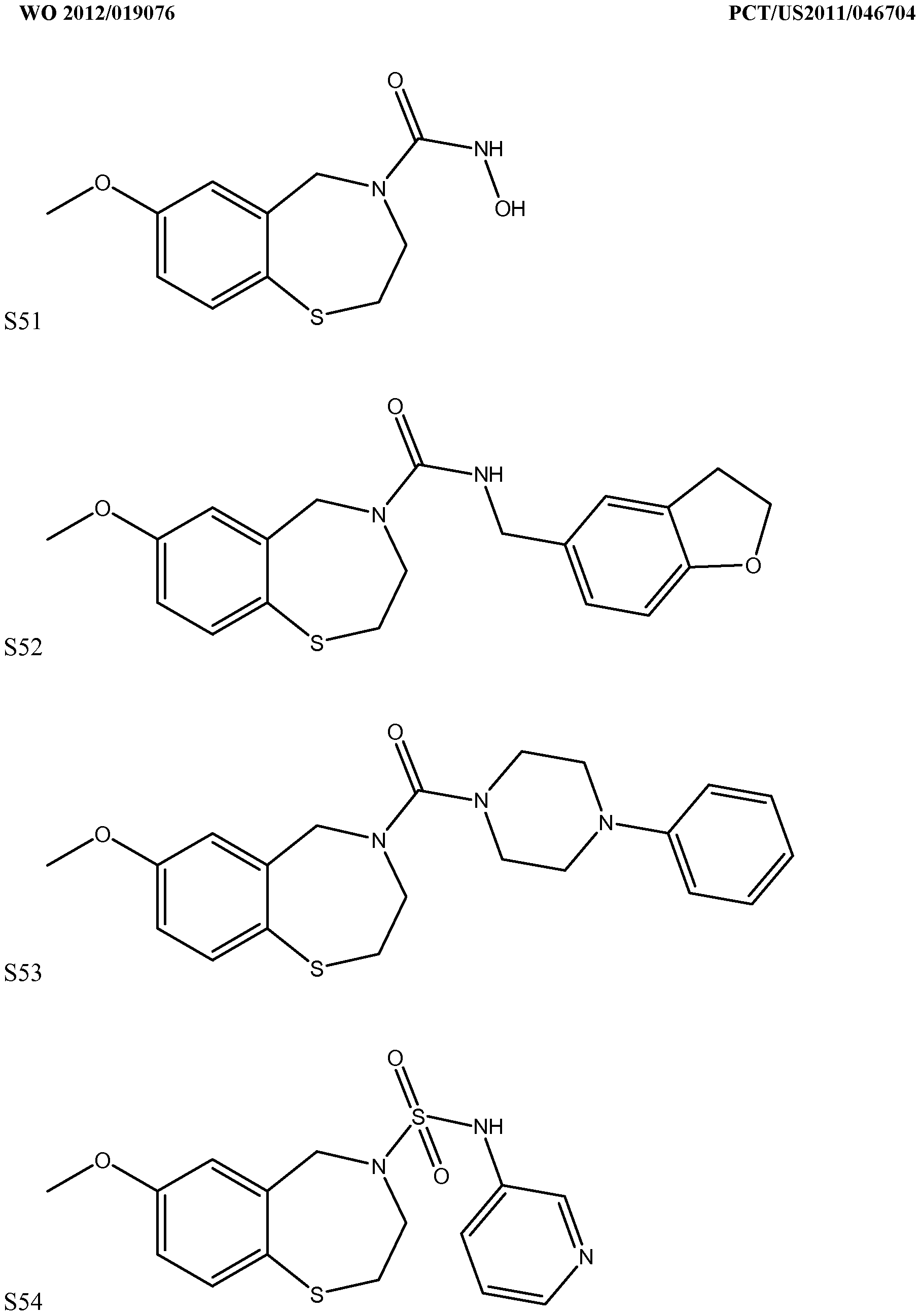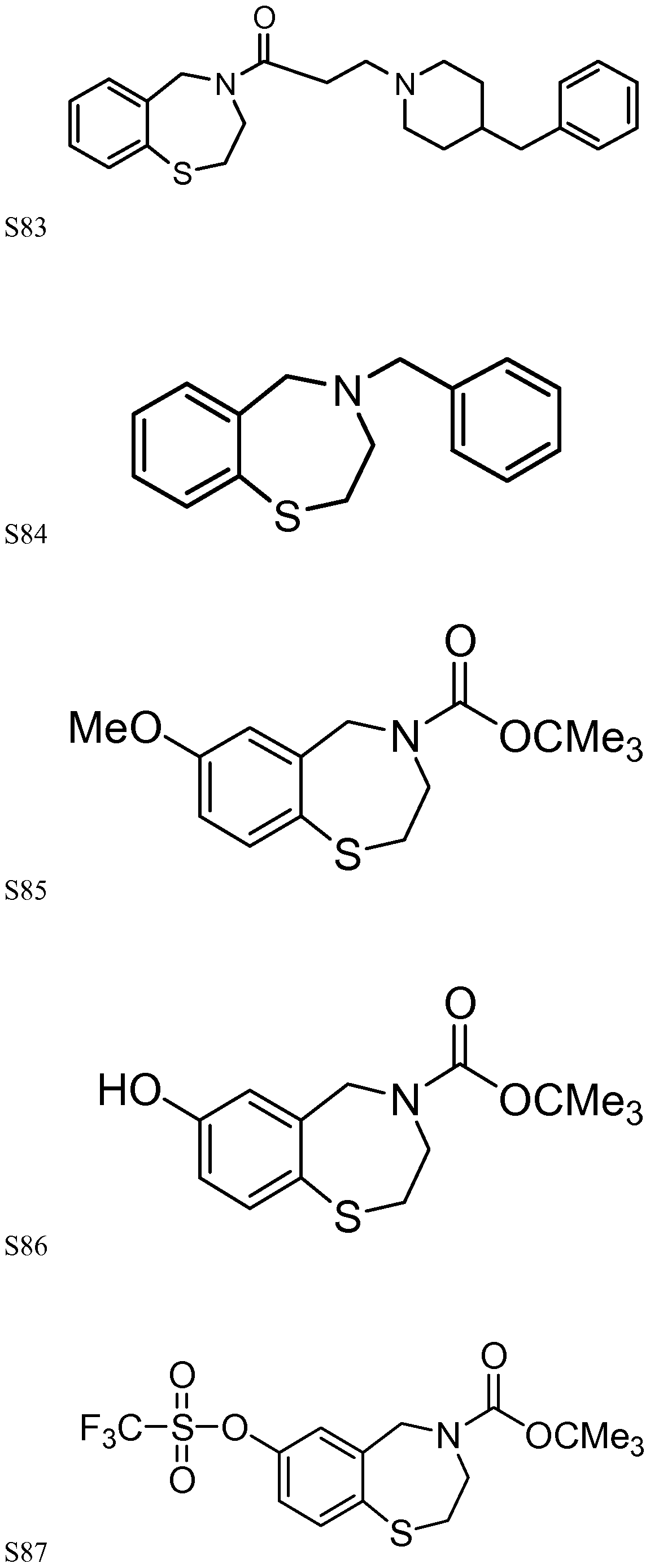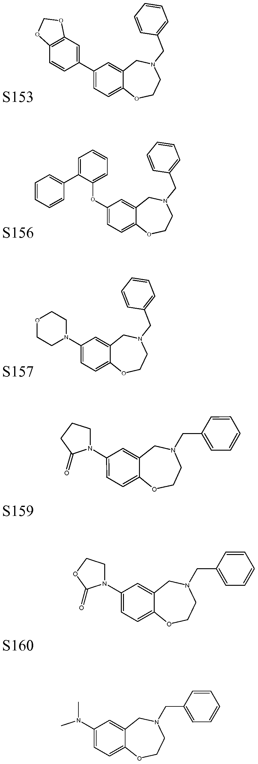 In these formulae, R, n and R2 are as in formula I-a-1 and Rd is CH2, NH, O, N-benzo[l,3]dioxo-5-yl, or N-C(=0)OC(R5)3, wherein the nitrogen in Rj may optionally be a quaternary nitrogen. The most preferred compounds of formula I-b-1 to I-i-1 include those where R is OR5 at position 7 of the benzoxazepine ring wherein each R5 is independently hydrogen, or an unsubstituted or substituted alkyl, alkylaryl, aryl, or heterocyclyl. Preferably, R is methoxy at position 7 of the benzothiazepine ring. Examples of compounds that may be used in conjunction with the invention include, without limitation, SI, S2, S3, S4, S5, S6, S7, S9, SI 1, S12, SI 3, S14, SI 9, S20, S22, S23, S24, S25, S26, S27, S36, S37, S38, S40, S43, S44, S45, S46, S47, S48, S49, S50, S51, S52, S53, S54, S55, S56, S57, S58, S59, S60, S61, S62, S63, S64, S66, S67, S68, S69, S70, S71, S72, S73, S74, S75, S76, S77, S78, S79, S80, S81, S82, S83, S84, S85, S86, S87, S88, S89, S90, S91, S92, S93, S94, S95, S96, S97, S98, S99, S100, S101, S102, S103, S104, S107, S108, S109, S110, Si l l, S112, S113, S114, S115, S116, S117, S118, S119, S120, S121, S122, S123, S136, S137, S138, S139, S140, S146, S147, S148, S149, S150, S151, S152, S153, S156, S157, S159, S160, S161, S166, S167, S182, S186, S189, S203, S217, S251, S252, S258, S277, S279, S282, S291, S293, S296, S301, S302, S306, S311, S312, S313, S318, S322, S324, S326, S331, S335, S337, S351, S352, S353, S354, S397, S398, S399, S423, S454, S463, S466, S470, S473 and S477, as herein defined. In certain embodiments, the compounds are isolated and substantially pure. The named "S" compounds described herein have the following structures: