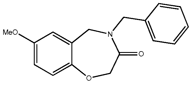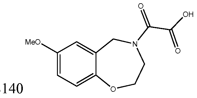 independently OR5, and wherein each R5 is independently hydrogen, or an unsubstituted or substituted alkyl, alkylaryl, aryl, or heterocyclyl. • Compounds of formula I-a-1 wherein R is OR5 at position 7 of the benzoxazepine ring, n, and R1-R4 are as in formula I-a-1, and wherein R5 is selected from the group consisting of hydrogen, or an unsubstituted or substituted alkyl, alkylaryl, aryl, or heterocyclyl. In one most preferred embodiment, R is methoxy. • Compounds of formula I-a-1 wherein n, R, Rl s R3, and R4 are as in formula I-a-1, and wherein R2 is selected from the group consisting of (i) R5, (ii) -C(=0)R6, and (iii) -(CH2)mRio, wherein R5 is hydrogen, or an unsubstituted or substituted alkyl, aryl, alkylaryl, heterocyclyl or heteroaryl; wherein 5 is -NRi3Ri4, -C(=0)NRi3Ri4 or -(C=0)OR5; and wherein Ri3 and Ri4 together with the N to which they are bonded form an unsubstituted or substituted heterocycle; and wherein m is 1, 2, 3, 4, 5, or 6, and wherein R10 is R5 or (C=0)OR5. • Compounds of formula I-a-1 wherein n, R, Ri, R3, and R4 are as in formula I-a-1, and wherein R2 is selected from the group consisting of R5, -C(=0)(C=0)OR5, -C(=0)NRi3Ri4, -CH2R10 and -C(=0)C(=0)NRi3Ri4, wherein R5 is hydrogen, or an unsubstituted or substituted alkyl, aryl, alkylaryl, heterocyclyl or heteroaryl; and wherein Ri3 N J F and Ri4 are either each H or are bonded to make , wherein Rd is CH2, NH, O, N-benzo[l,3]dioxo-5-yl, or N-C(=0)OC(R5)3, wherein the nitrogen in Rj may optionally be a quaternary nitrogen; and wherein Rio is R5 or (C=0)OR5. In one most preferred embodiment, R2 is -C(=0)C(=0)OH. • Compounds of formula I-a-1 wherein n, R, Rls and R4 are as in formula I-a-1, and wherein R2 and R3 together with the nitrogen and carbon to which they are respectively attached, form an unsusbstituted or substituted heterocycle other than a piperazine. • Compounds of formula I-a-1 wherein n, R, Ri and R2 are as in formula I-a-1, and wherein R3 and R4 together with the carbon atoms to which they are respectively attached, form an unsusbstituted or substituted cycloalkyl or heterocyclic ring. Still other preferred compounds of the present invention include those of formula I-a-1, wherein (a) n is 1 or 2, R is Z, OCZ3, R5, OR5, CN, N02, N(R5)2, -C(=0)N(R5)2, -C(=0)OR5, or