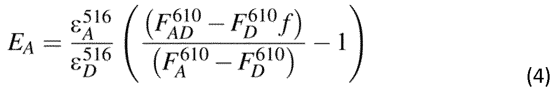 Equation 3 still needs correction for f61^ , the (non-negligible) donor fluorescence at Cherry emission wavelengths. F61o° is determined from the donor-only measurements (D) but is subject to FRET-based quenching in the mixed (AD) sample: